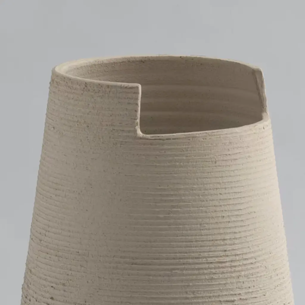 The Cut Vase Small in Light Sand features clean, minimalist cuts, handcrafted from clay by skilled turners. Inspired by Japanese Zen gardens, its design evokes tranquility and meditation, with a light sand finish that recalls the serene lines of a rake in the sand. It is fired in a single “biscuit” baking process, highlighting its natural color and striped texture. Available in different finishes.
