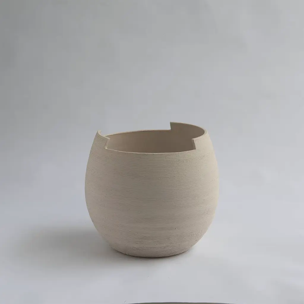 The Cut Vase Small in Light Sand features clean, minimalist cuts, handcrafted from clay by skilled turners. Inspired by Japanese Zen gardens, its design evokes tranquility and meditation, with a light sand finish that recalls the serene lines of a rake in the sand. It is fired in a single “biscuit” baking process, highlighting its natural color and striped texture. Available in different finishes.