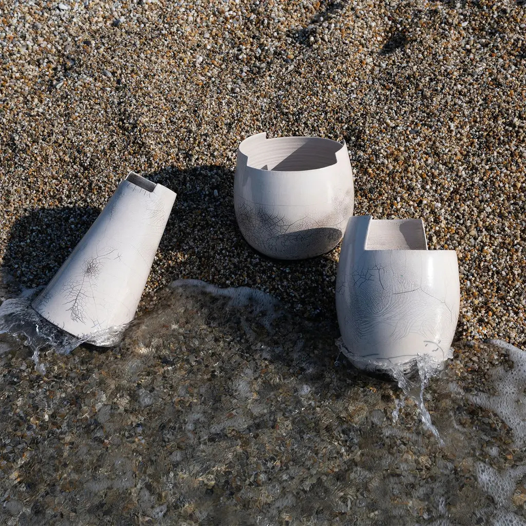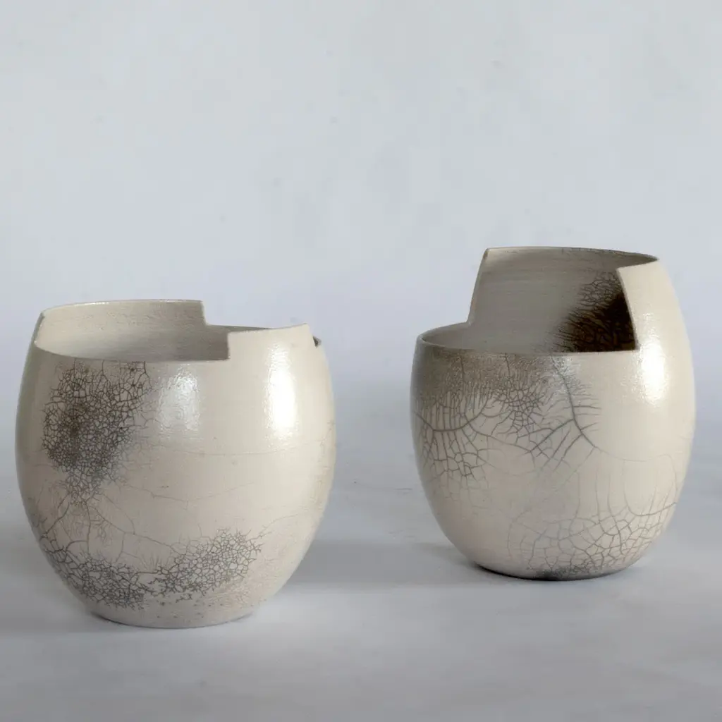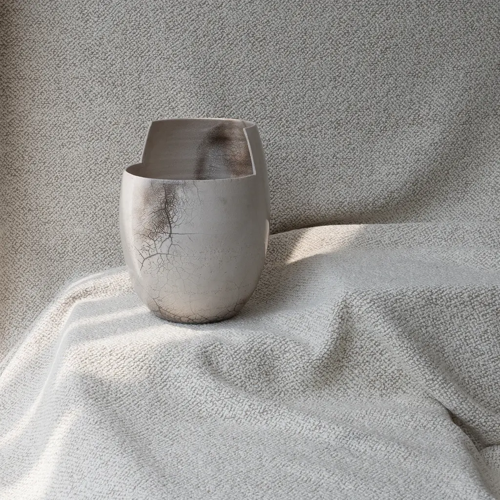 Distinguished by sharp cuts, our clay pieces are carved by the turner. Their minimal design draws inspiration from Japanese oriental taste, the birthplace of the Raku technique used. The aesthetic focus of Raku ceramics is on wabi-sabi: an ideal of beauty found in imperfect and weathered objects. In Raku firing, the glaze and smoke determine the texture of the vessels. Available in other finishes, please contact the Concierge for more details.