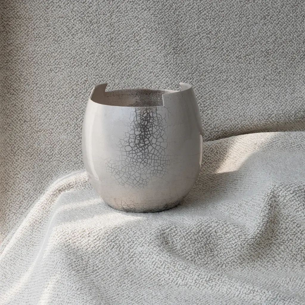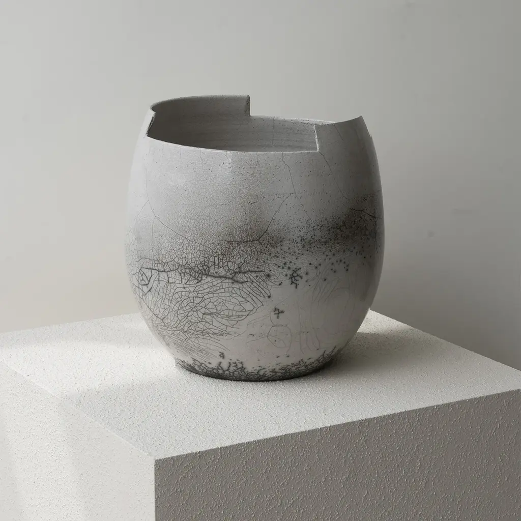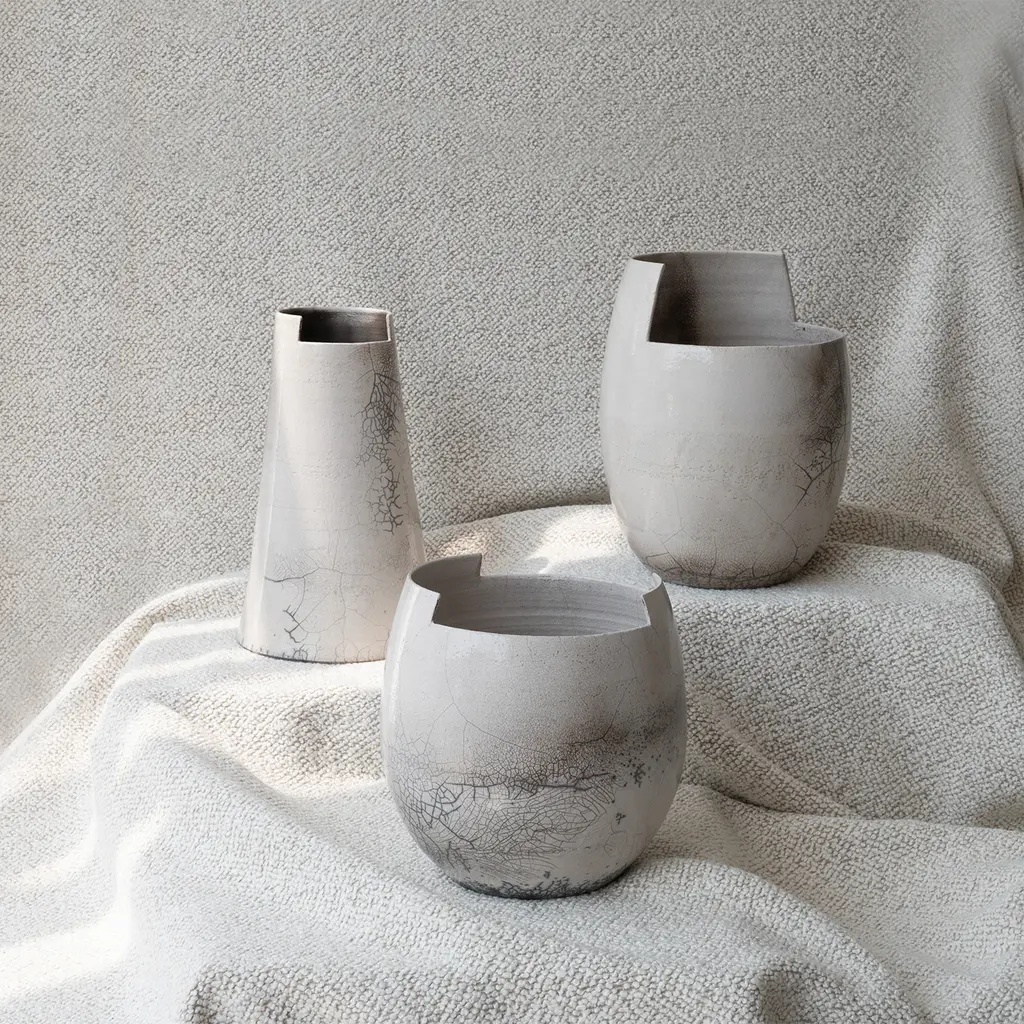 Characterized by clean cuts made directly on the wheel, the cut small raku clear ceramic vase embodies minimalist design inspired by Japanese aesthetics where the raku technique originates. This method accentuates the beauty of simplicity, creating unique crackle patterns and tones through glaze and smoke effects during firing. Embracing the wabi-sabi ideal, the vase celebrates imperfection and the passage of time, making each piece visually distinct. It complements contemporary and serene interiors.