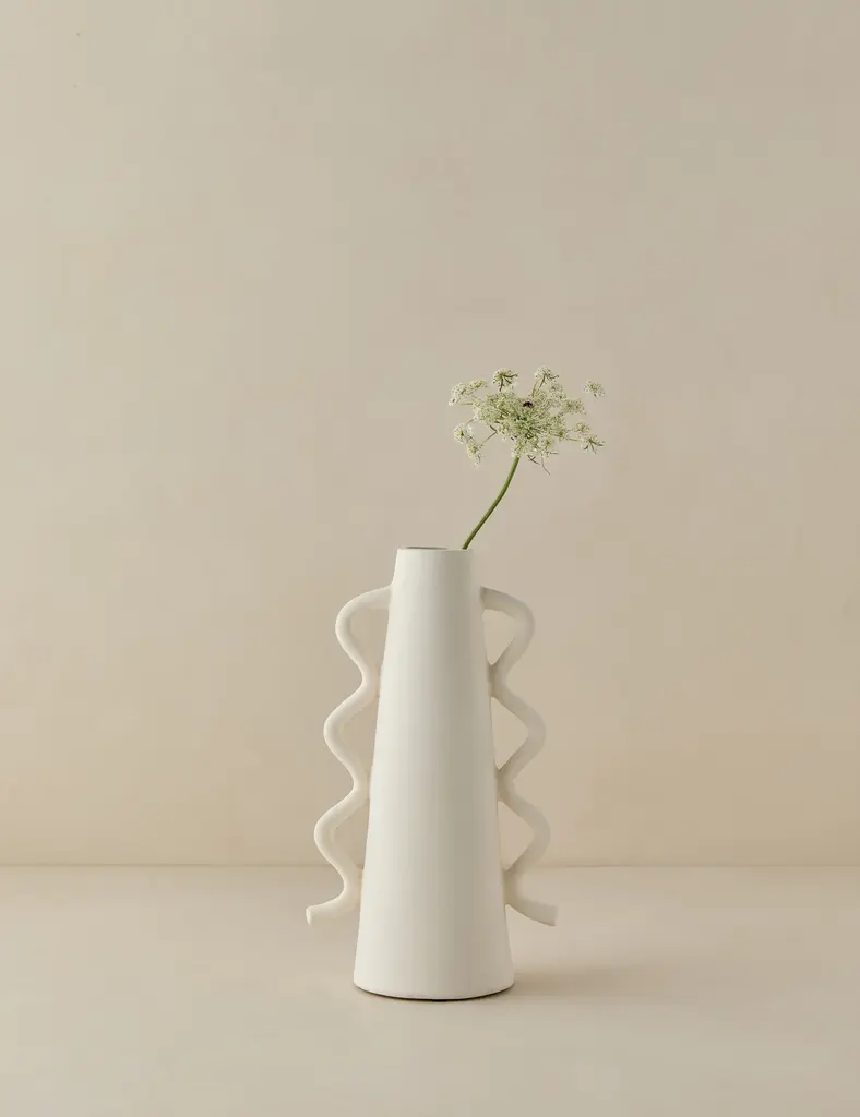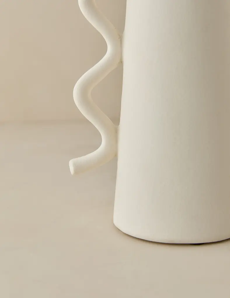 Sleek and slender with a playful edge, our Cyrene vase is the perfect addition to a modern space. Its wavy coil handles cut a unique silhouette that will catch the eye in any grouping. The white finish makes this piece easy to mix and match with other favorite decor pieces.