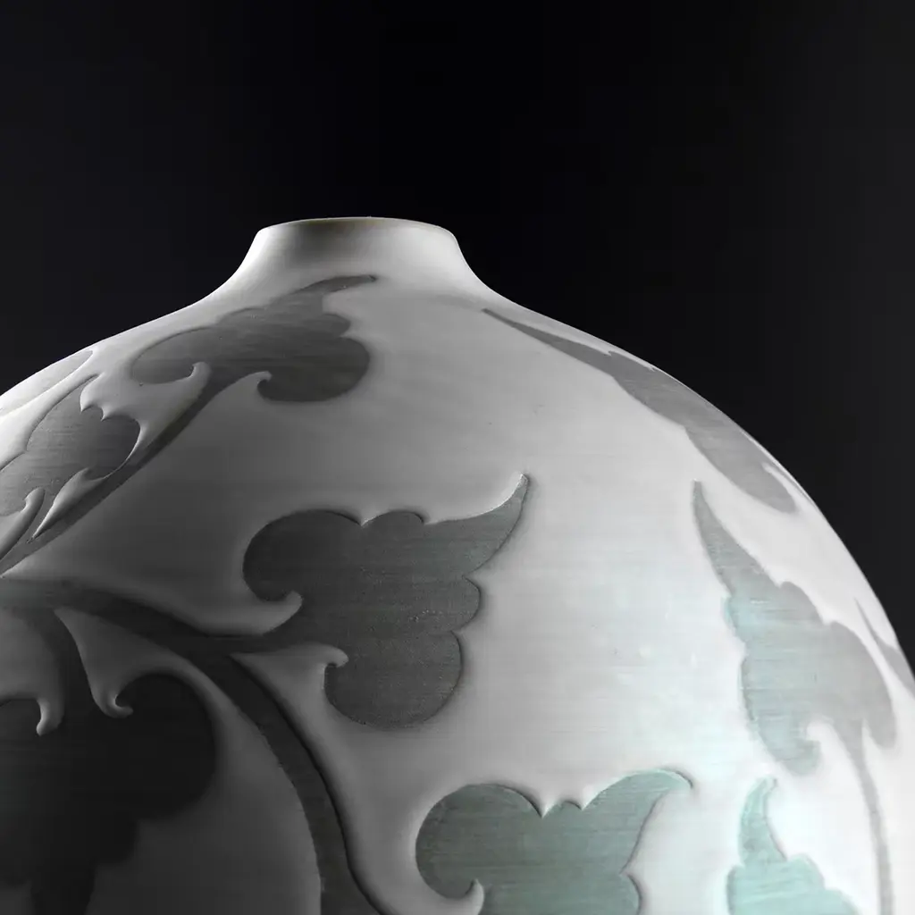 Reminiscent of the metallic flair of damask fabric, this vase exudes refined sophistication in its unique, contemporary design. Exquisitely handcrafted of white ceramics, it boasts an olive shape adorned with a floral decoration marked by a sage green metallic finish.