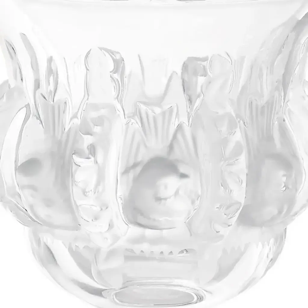 Designed in 1948 by Marc Lalique, this vase is decorated with carved birds in satin crystal. Through this vase, Lalique pays tribute to two themes dear to René Lalique, the Fauna and Flora . This piece takes us to a dreamlike state of nature, answering a need for authenticity and wellbeing. Trained as a jeweler at the Ecole des Arts Decoratifs in Paris in the late 1880's, Rene Lalique gained recognition as an independent designer for some of the era's great jewelry houses including Cartier and Boucheron. Eventually, he turned to glassmaking, and his techniques were a triumph for the Art Deco movement. Every piece of Lalique is finely detailed and produced by hand in Alsace, France.