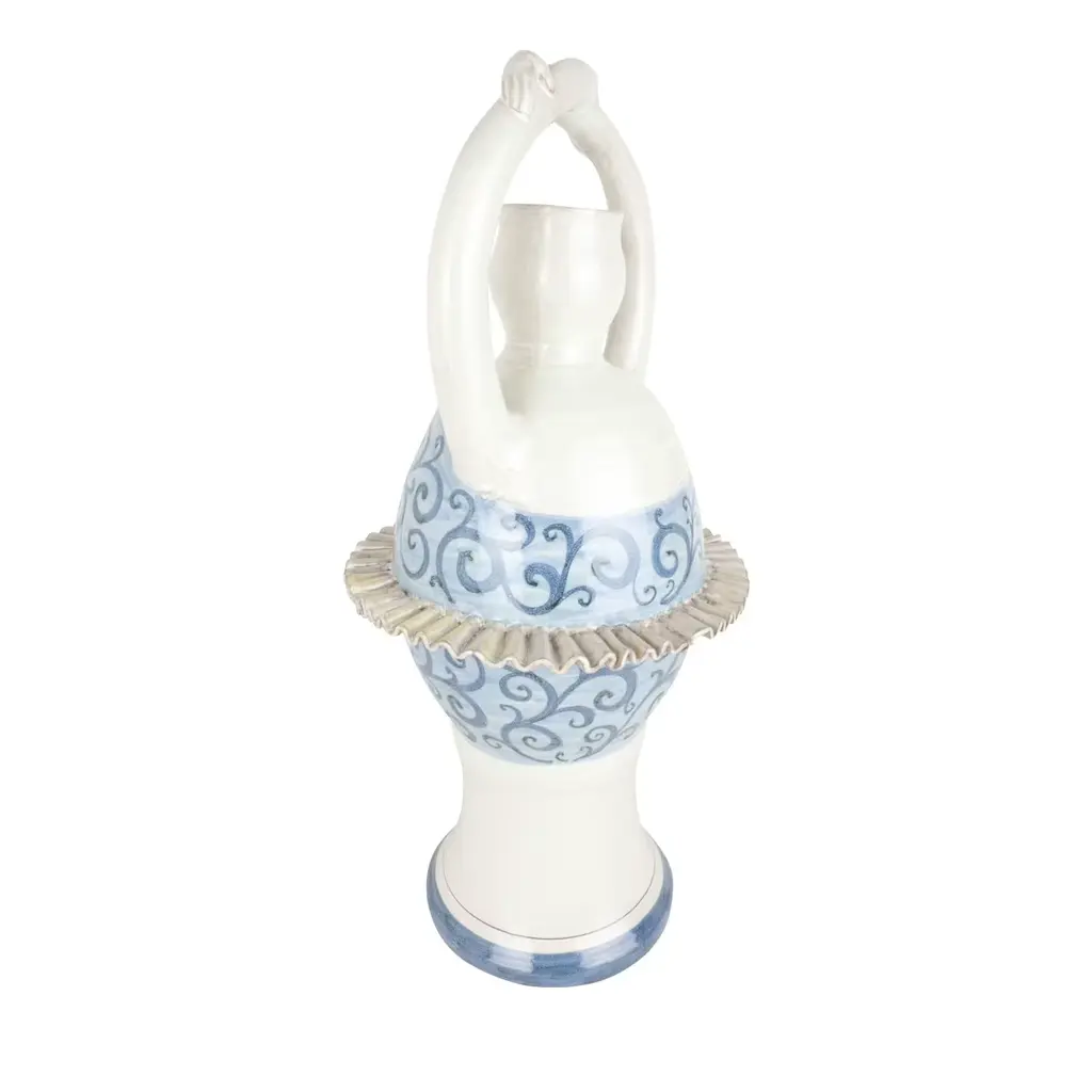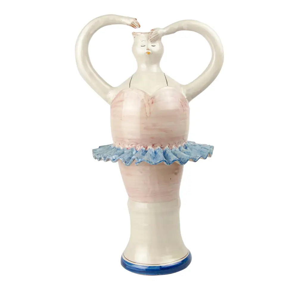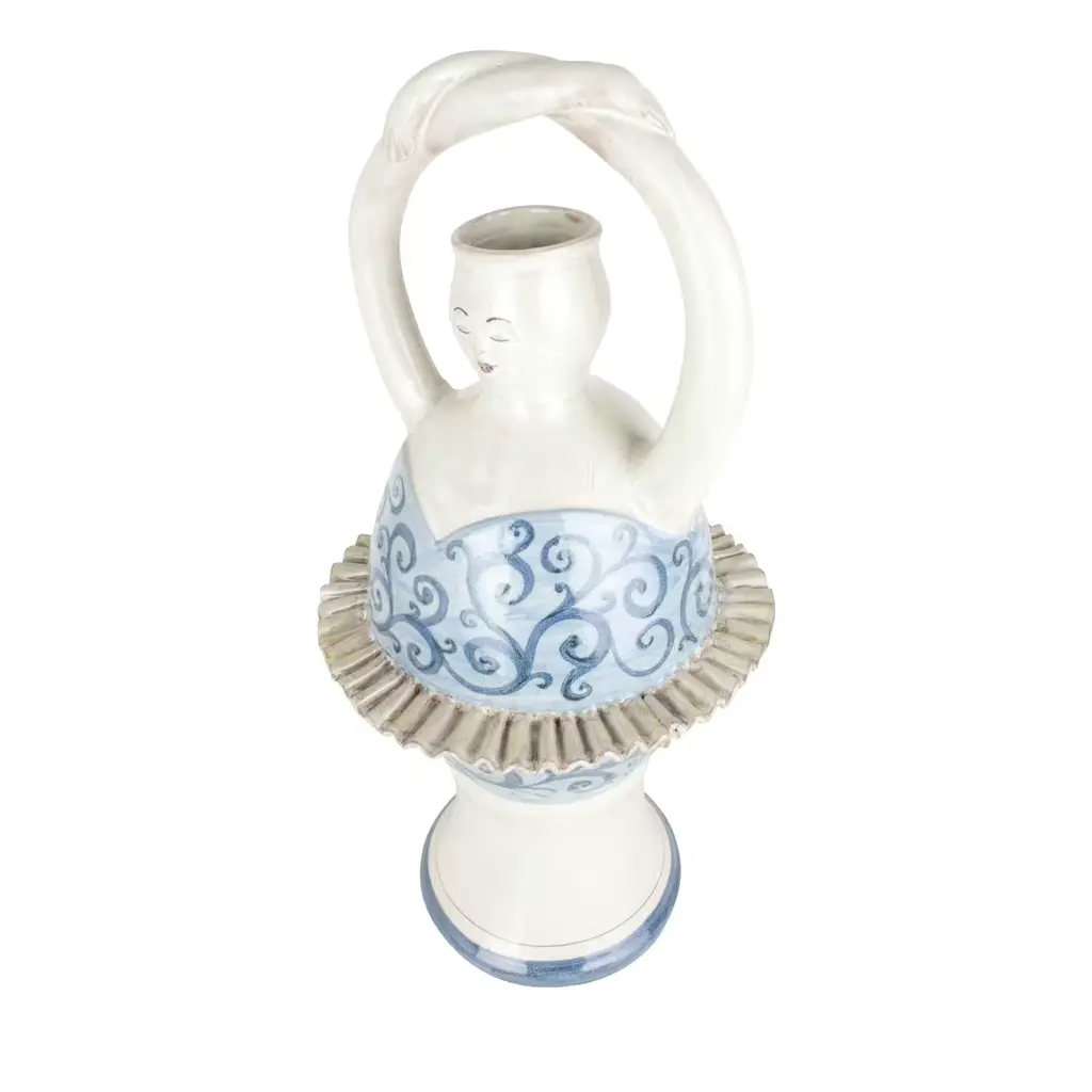 This delightful hand-made ceramic creation can be used both as a sculptural decoration and as a functional object for storage of liquids. Depicted on this vase, made on a lathe, is an elegant ballerina in the middle of a performance. Her arms stretched above her head become the single handle for the vase. Her delicate blue dress is decorated with swirling lines and her tutu is extended outward from her waist circling the entire dancer. This piece will made a charming addition to any home.