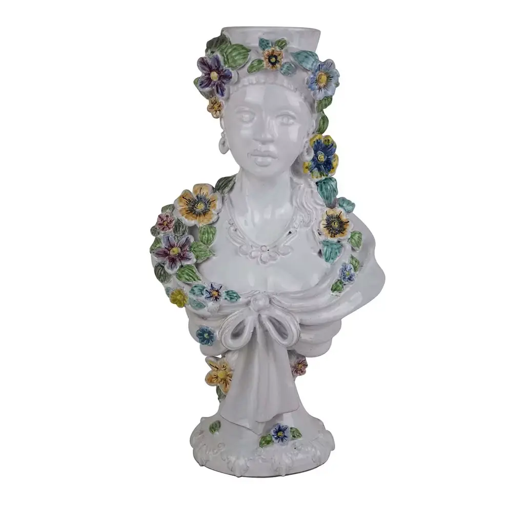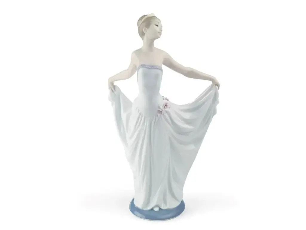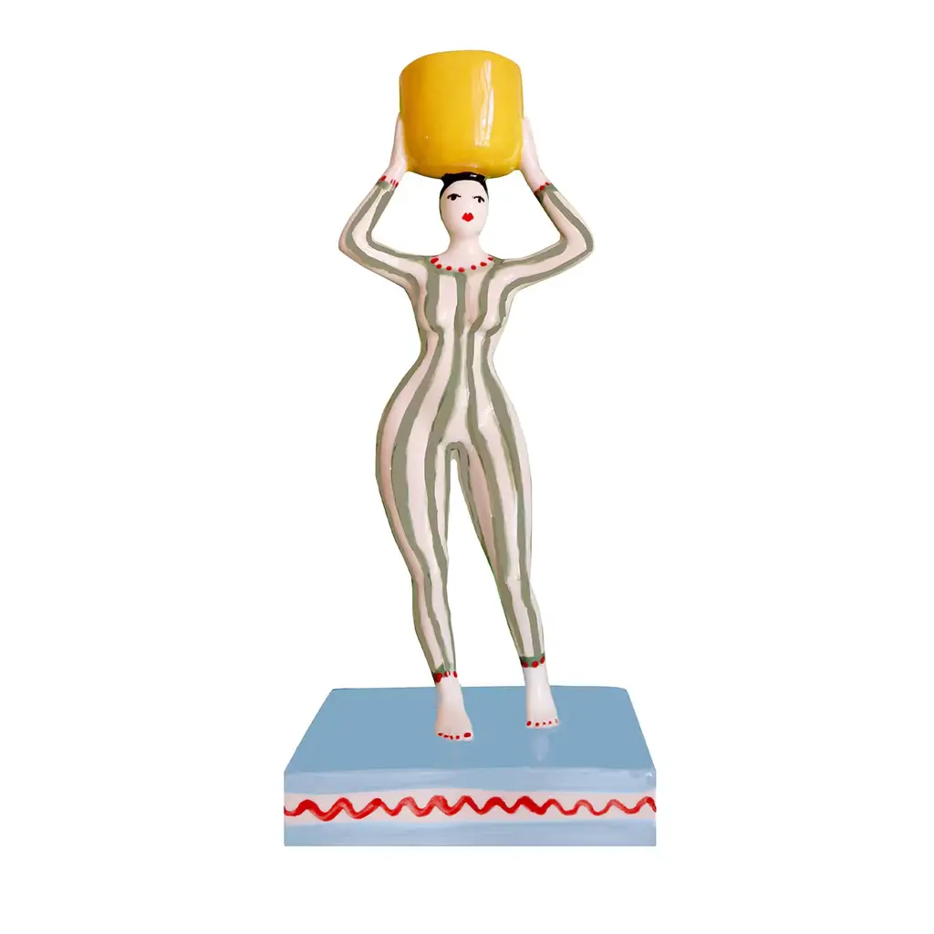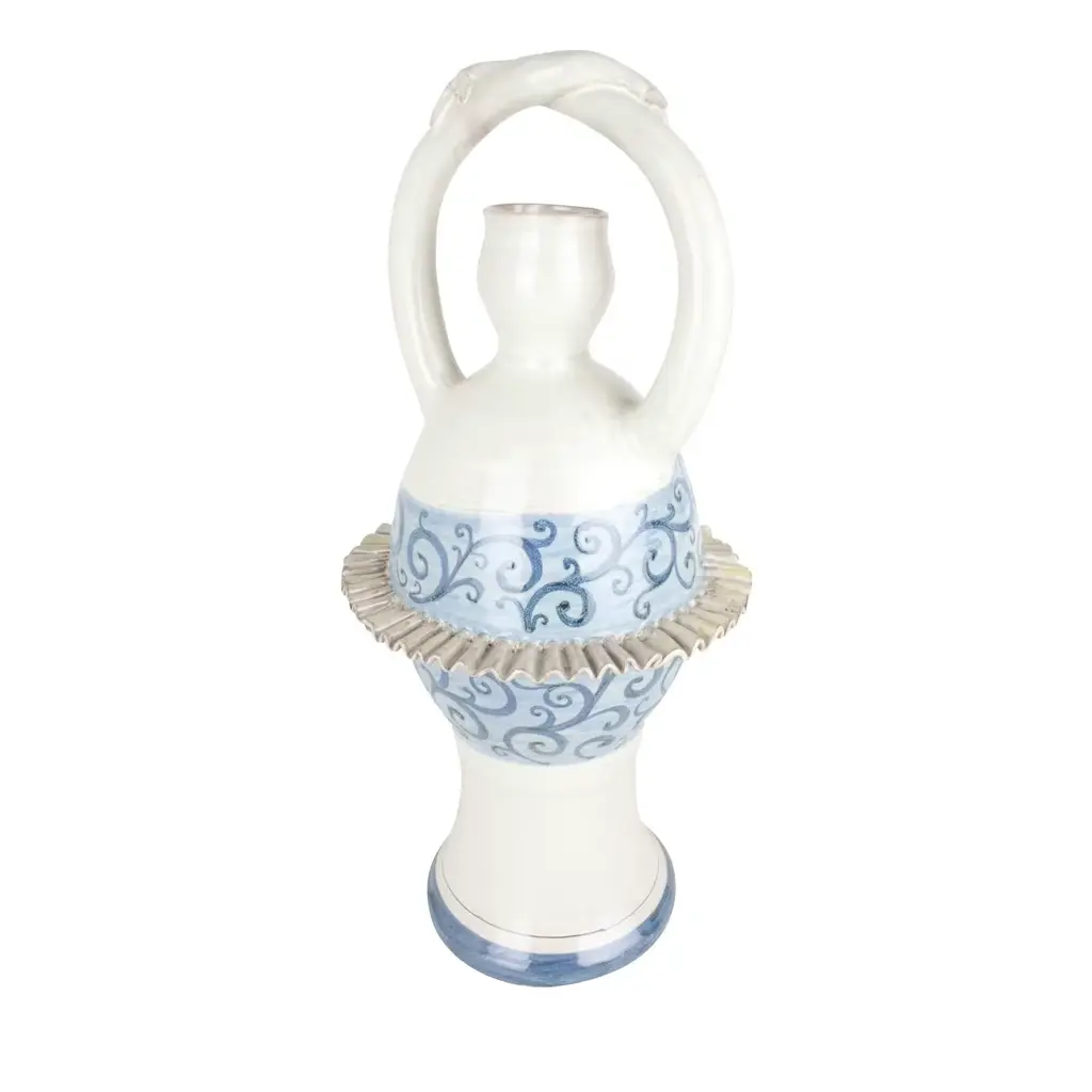 This delightful hand-made ceramic creation can be used both as a sculptural decoration and as a functional object for storage of liquids. Depicted on this vase, made on a lathe, is an elegant ballerina in the middle of a performance. Her arms stretched above her head become the single handle for the vase. Her delicate blue dress is decorated with swirling lines and her tutu is extended outward from her waist circling the entire dancer. This piece will made a charming addition to any home.