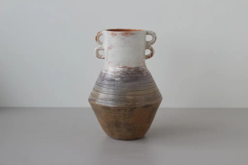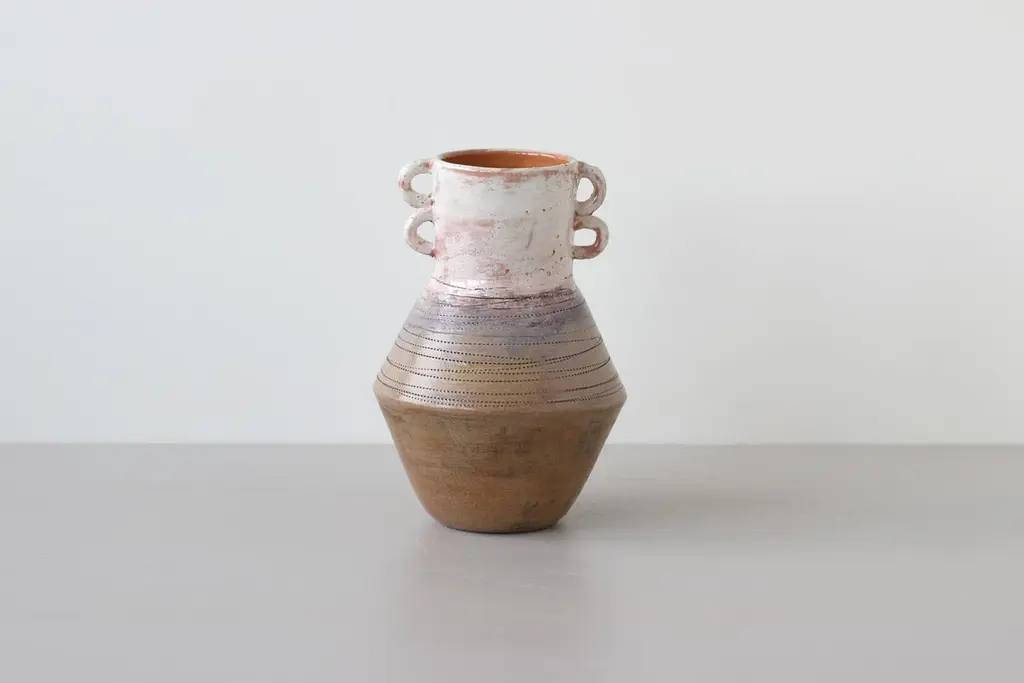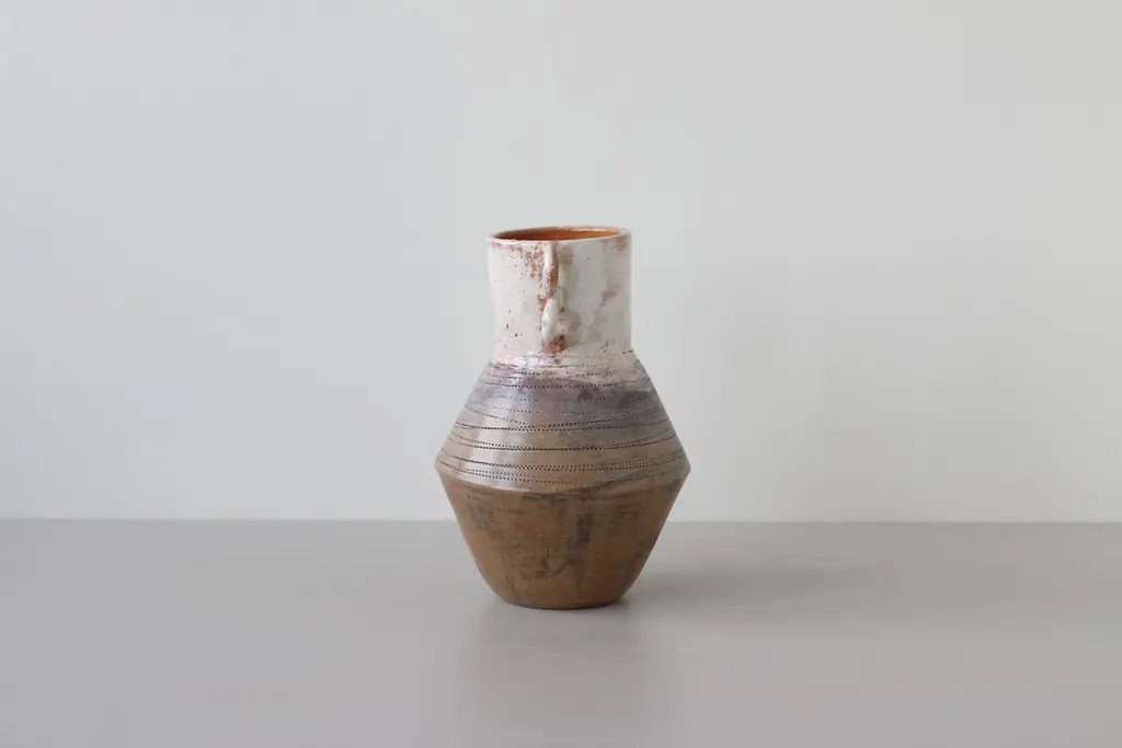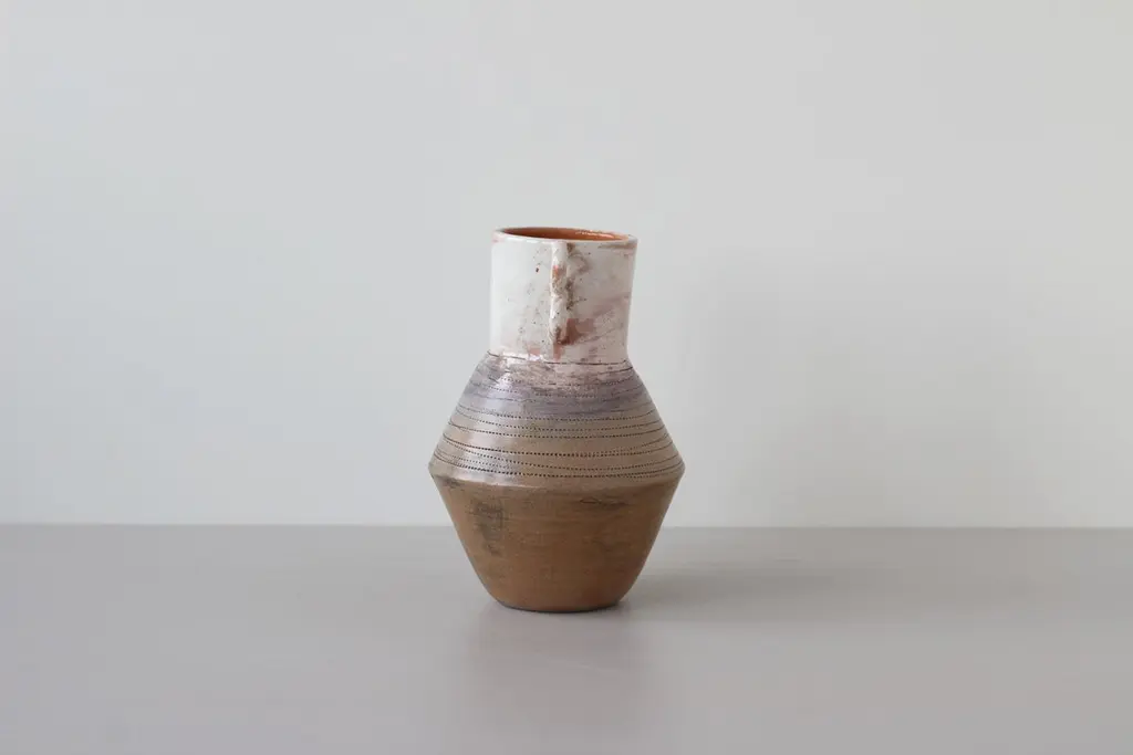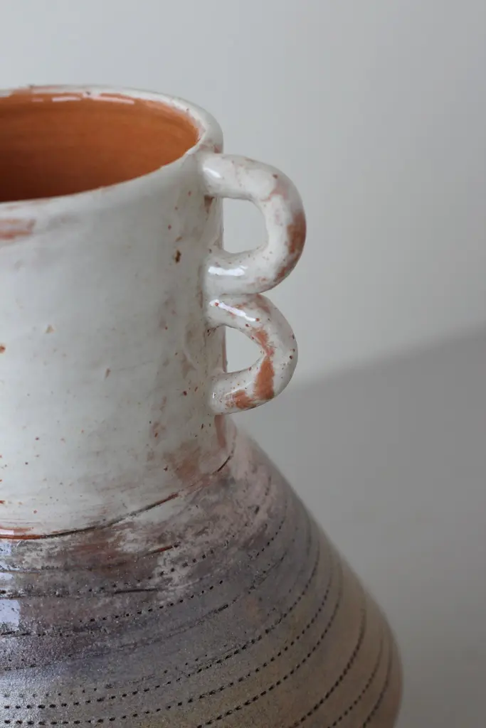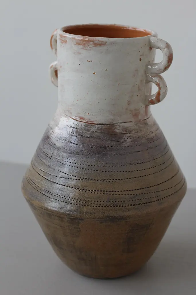 Dancer vase by Eguzkiñe EgañaUnique Piece.Dimensions: W 15 x D 15 x H 22.5 cm.Materials: Terracotta slip and glaze.Eguzkiñe Egaña Corta studied advertising and for more than 20 years has worked as a graphic designer. About 12 years ago, surrounded by a completely digital world, she felt the need to create with her hands and it is from there that she took up her drawings and illustrations and began to create with ceramics. She has completed a Master’s degree at the University of the Basque Country: “Ceramics; art and function” and combines her work as a designer and illustrator with contemporary artistic creation. She also teaches ceramics classes at the municipal school of Zarautz, a city in the Basque Country where she lives. She feels the need to explore the relationship between identity and self-knowledge. Work with the concepts; interior, exterior, return, connect, ancestral and artisanal, establishing a relationship between us and our environment, as well as between us and our ancestors, either emotionally, empathetically or through objects that somehow transport us to a hypothetical place in the past, both for its aesthetics and for the ways in which they have been created. Human beings are containers of desires, fears, expectations. Sometimes it is necessary to empty ourselves of everything that clutters the mind. On many occasions the artist works with turned containers reflecting this analogy. The rope is an element that she is interested in using in these sculptures, due to its conceptual charge. Unite, tie, join, analogies that the artist compares with the force of love that transcends life and death and that unites the past, the present and the future.