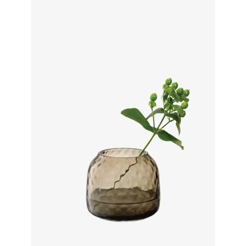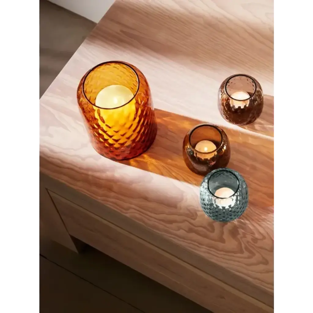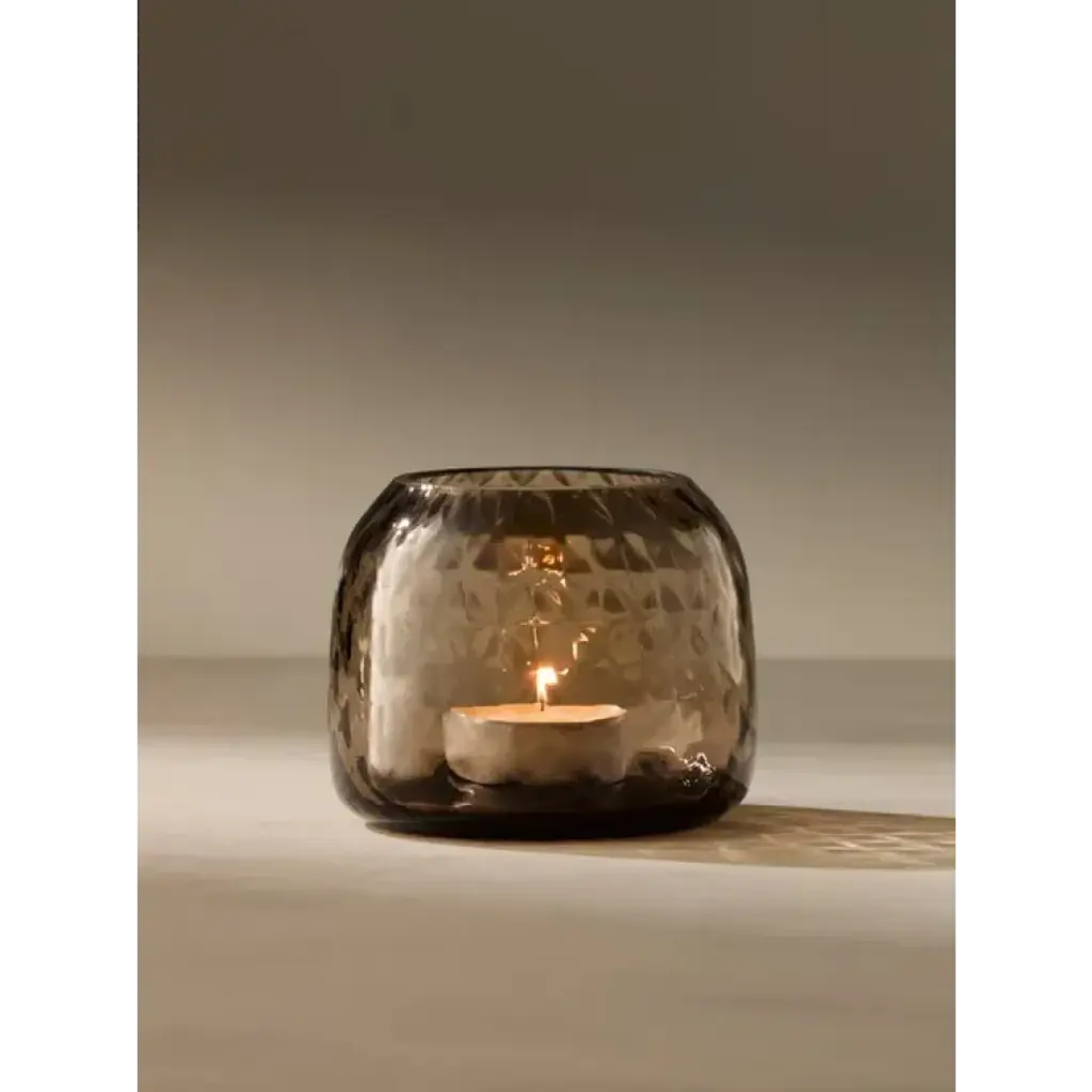 A rounded mouth-blown tealight holder/vase with fine walls and an all over texture. Supplied with tealight candle. When a candle burns within, the undulating surface beautifully refracts the light, casting a patterned glow over the room.