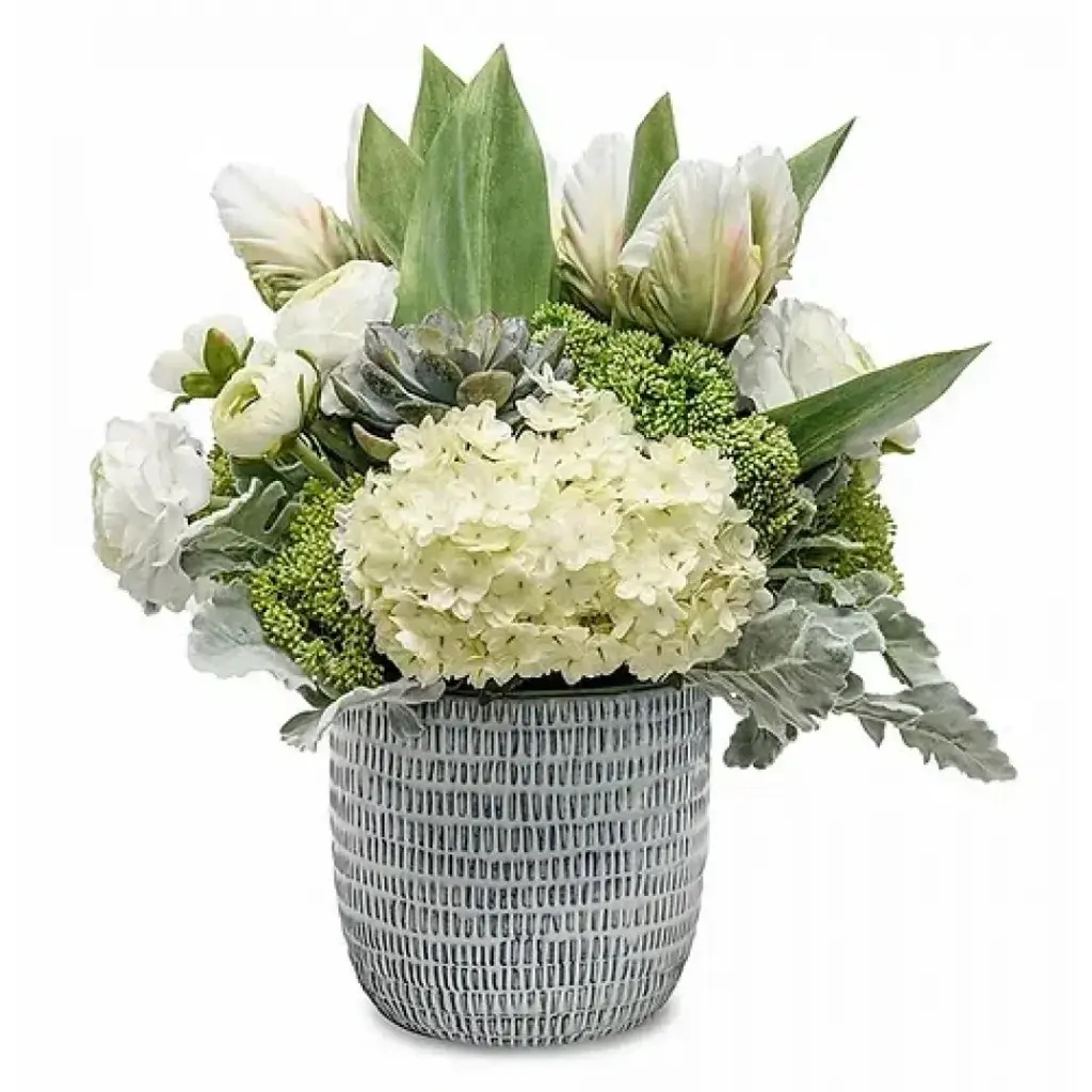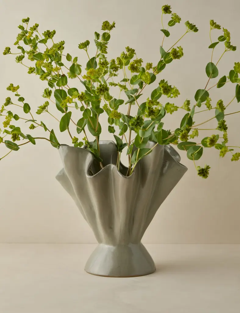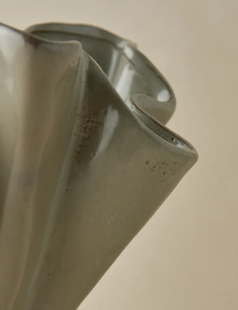 Add texture and dimension to your tabletop decor with this ruffled stoneware vase. Its organic lines evoke sculptural appeal on any surface—whether filled with botanicals or standing alone. The reactive glaze creates an eye-catching finish unique to each piece.