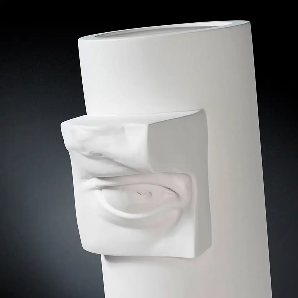 This splendid white ceramic vase exudes a boldly refined character that combines classic Italian art inspiration with modern design. Showcasing a clean, cylindrical shape, it is decorated with a handcrafted eye inspired by Michelangelo's representation of David's ear. This piece will effortlessly infuse a touch of sophistication into both modern and minimalist interiors.