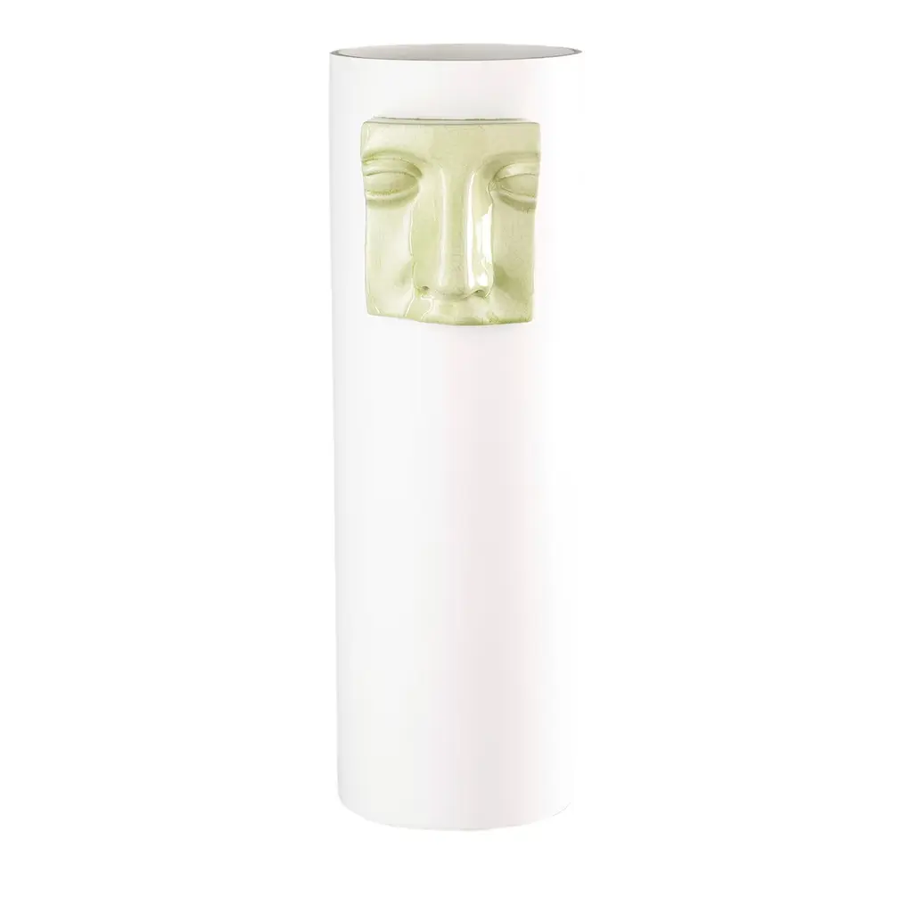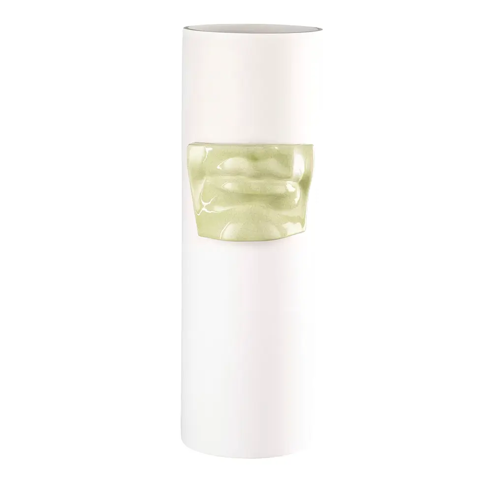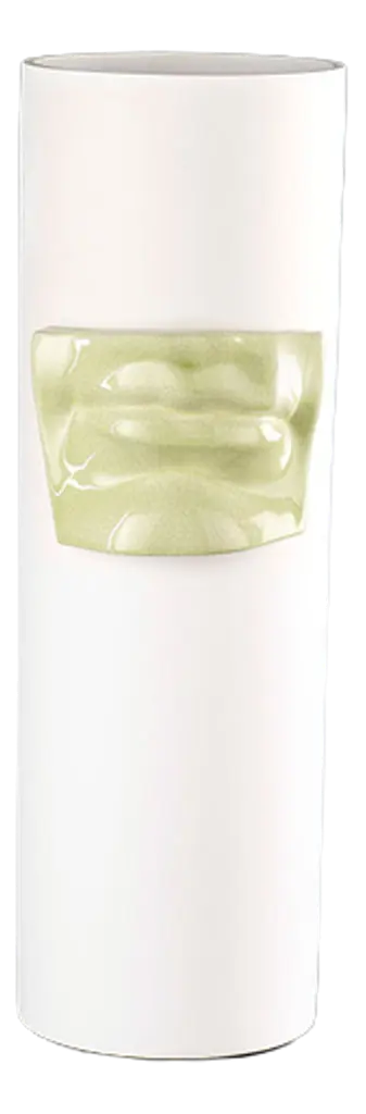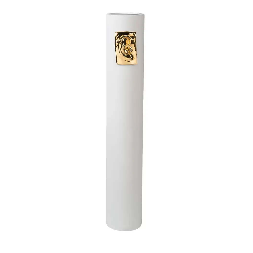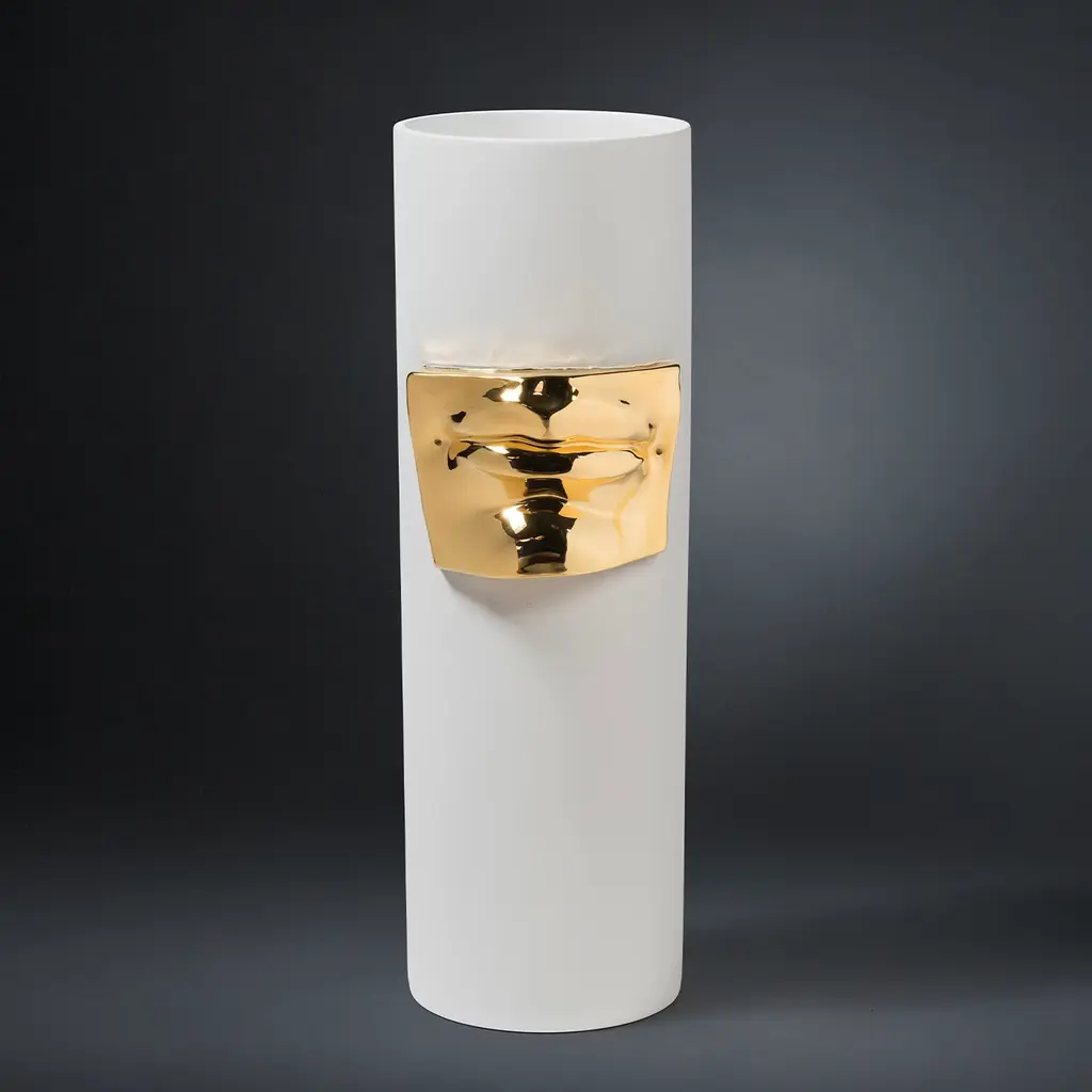 Revealing the subtle elegance of Italian art and handicraft, this stunning vase boasts an elegant and refined flair. Marked by a sleek cylindrical silhouette, it is masterfully handcrafted of white ceramic and features a magnificent low relief depicting Michelangelo's David lips plated in 24k gold.