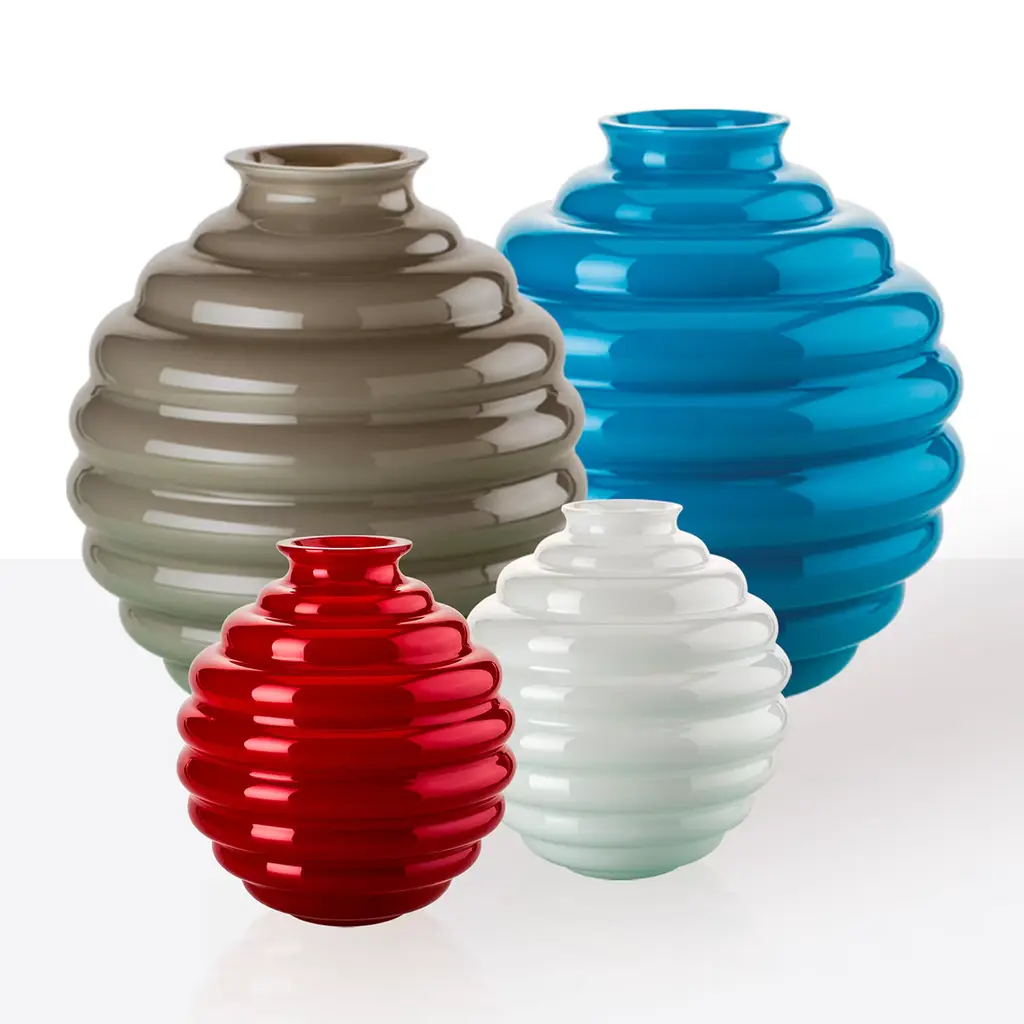 Designed by Napoleone Martinuzzi, artistic director of Venini from 1925 to 1931 and one of the most important innovators in Murano glassmaking, this blown glass vase is defined by a rounded silhouette enhanced by repeated horizontal rings. Art Déco style and Venetian glassmaking tradition combine harmoniously in this remarkable vase that was handcrafted entirely with the century-old opaline technique that confers a vivid and intense red color to the smooth glass. This piece is currently on show and immediately available at Artemest Galleria New York.