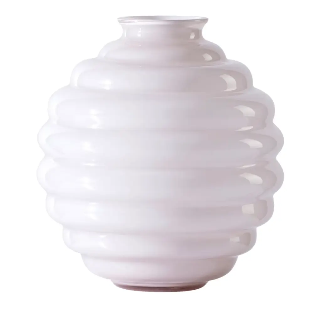 A sculptural objet d'art designed by artist Napoleone Martinuzzi and handcrafted by Venini's master glassmakers, this refined vase will be a bold focal point in any decor. Sinuous and polished, its archetypical spiral shape recalling that of a shell is enhanced by a delicate river-green shade that is subtly darker at the base and around rim.