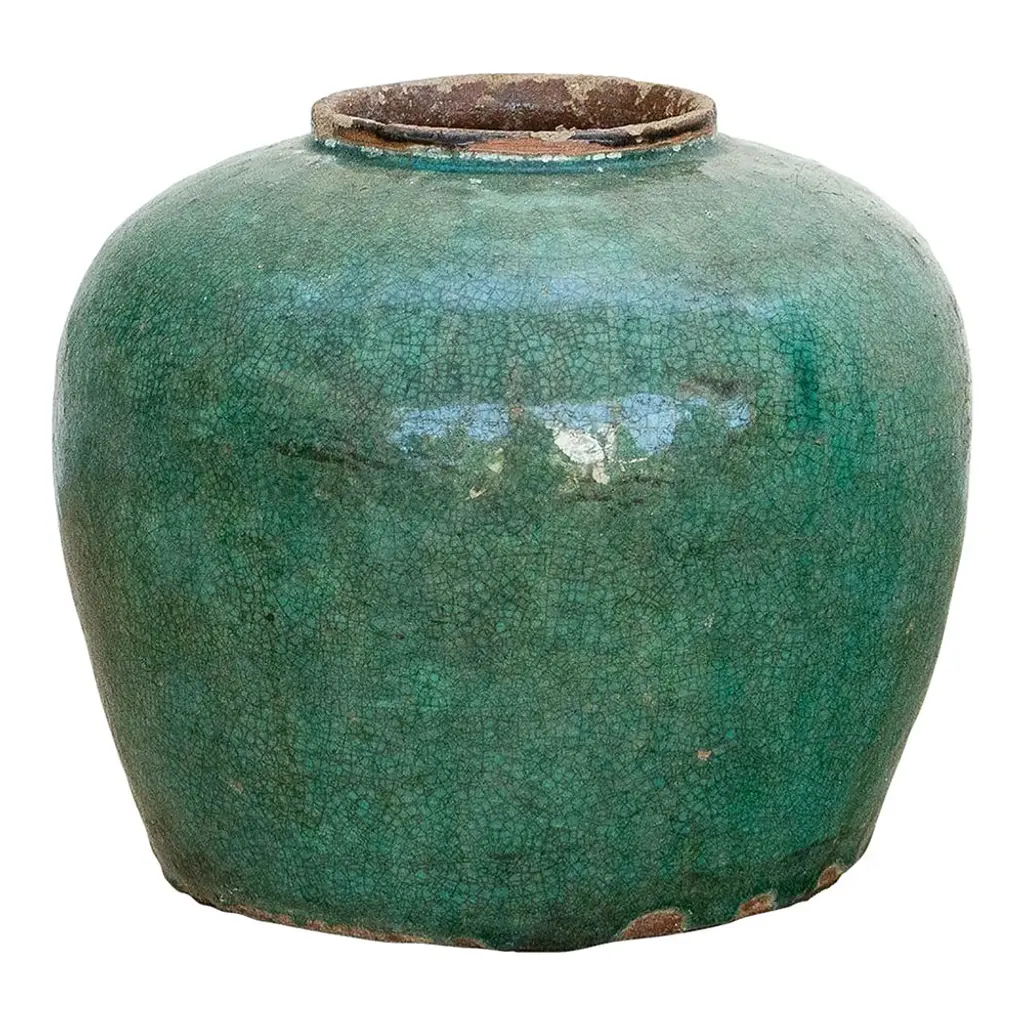 Early 20th century Chinese ceramic vase. This antique farmhouse style ceramic jar has a beautifully aged emerald green glazed finish. This lovely antique pot was originally used to store honey or oil.