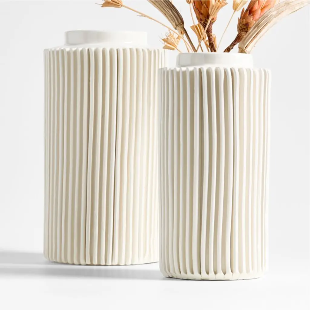 To create the exaggerated ribbing on our small Della vase, skilled artisans throw the cylindrical form by hand, let it partially dry, then apply flat pieces of clay one at a time. Pleasantly uniform yet delightfully organic, the ivory-glazed vessel suggests ancient columns as well as modern architecture. Della stands on its own as an eye-catching ceramic sculpture or adds understated sophistication to dried stems and faux botanicals.