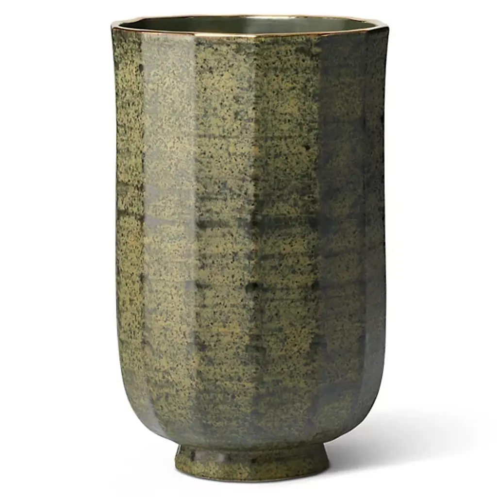 The Delmara Vase from AERIN draws from Austrian Art Deco glassware and vintage lighting to create a faceted ceramic vessel perfect for long-stemmed arrangements. The slip-casting process creates crisp angular lines that define each face of the vase, while the hand-applied glaze produces brushed patterns that vary across the surface. Each piece features a gilded rim that frames the opening and complements the handcrafted glaze work below. The vase's proportions and faceted design make it equally suitable for single dramatic stems or fuller bouquets.