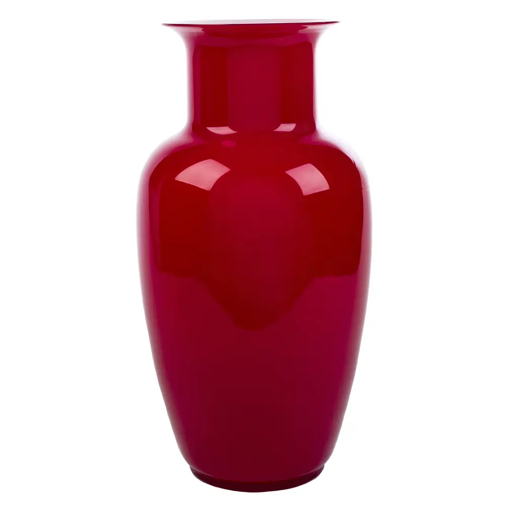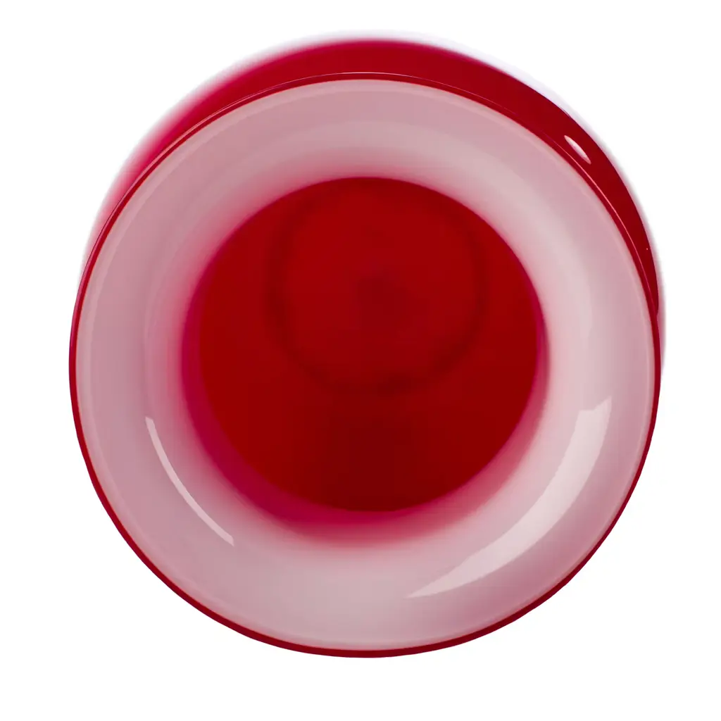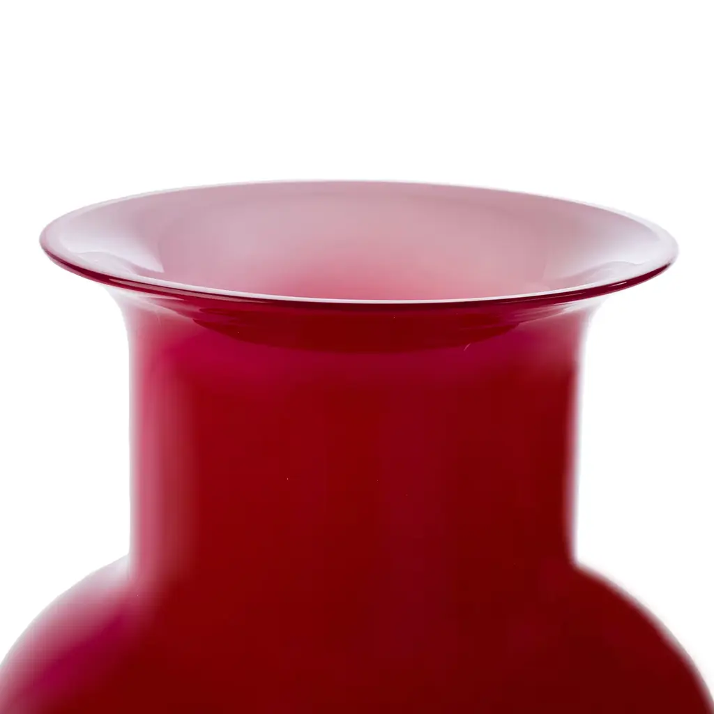 Master glassmakers handcrafted this superb vase in Murano glass by blending ancient techniques as the "incamiciato" one, which consists of melting the sides of two different-colored glass sheets and sealing them together for an intriguing two-tone look. Glamorous and refined, this vase is deftly mouthblown and is distinguished by a delicate white interior standing in contrast with the vibrant red exterior.