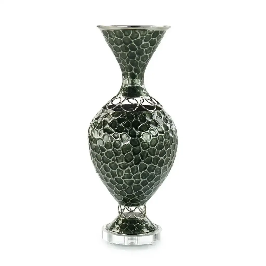 The Demeter Vase is a magnificent design statement that commands attention within an interior space. This vase crafted from enameled brass showcases a classic silhouette elevated through a gorgeous green tone overlain with organically shaped Nickel accents. The piece features an innovative use of negative space, bridging the body and neck with an assortment of hollow rings. The piece gracefully stands atop a circular base of clear acrylic, completing the look.
