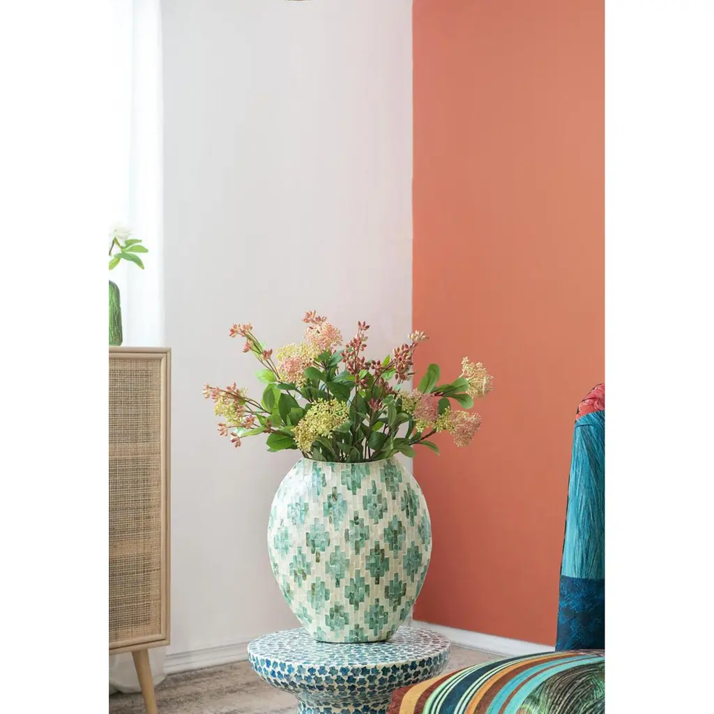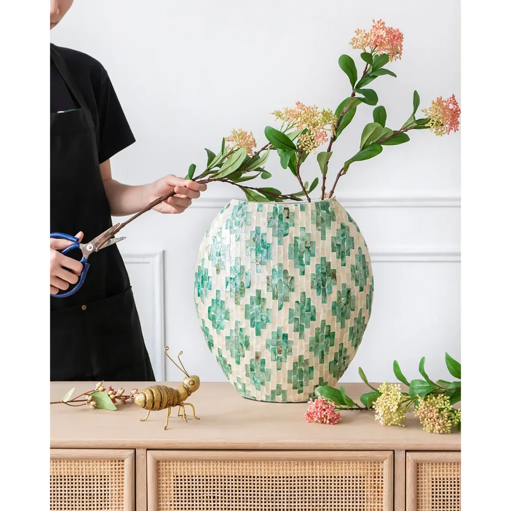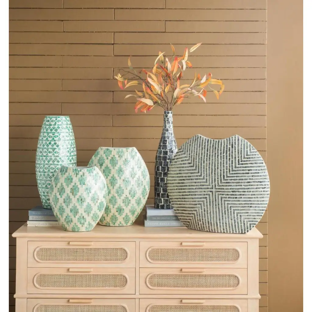 With a diamond pattern running along its petite green and tan frame, this Capiz vase is an accent piece that cant be missed. The oval shape and Capiz inlay amplify the vases bohemian style, and the size allows it to serve as a centerpiece on a table or mantle. An elegant design that complements its contents and surroundings, ideal for a living room or foyer.