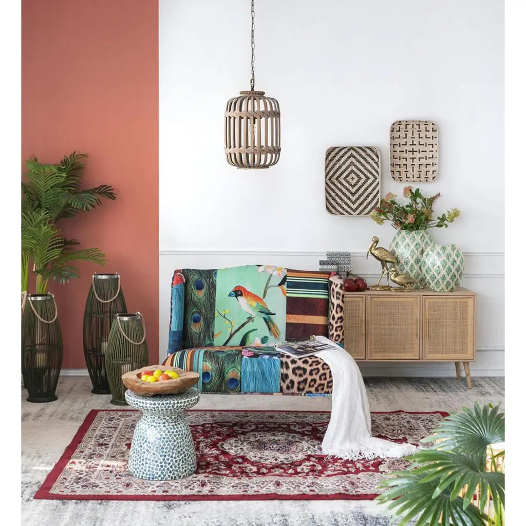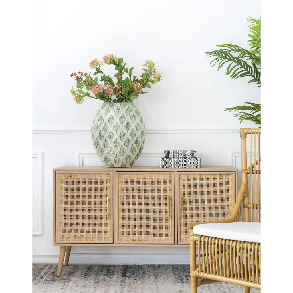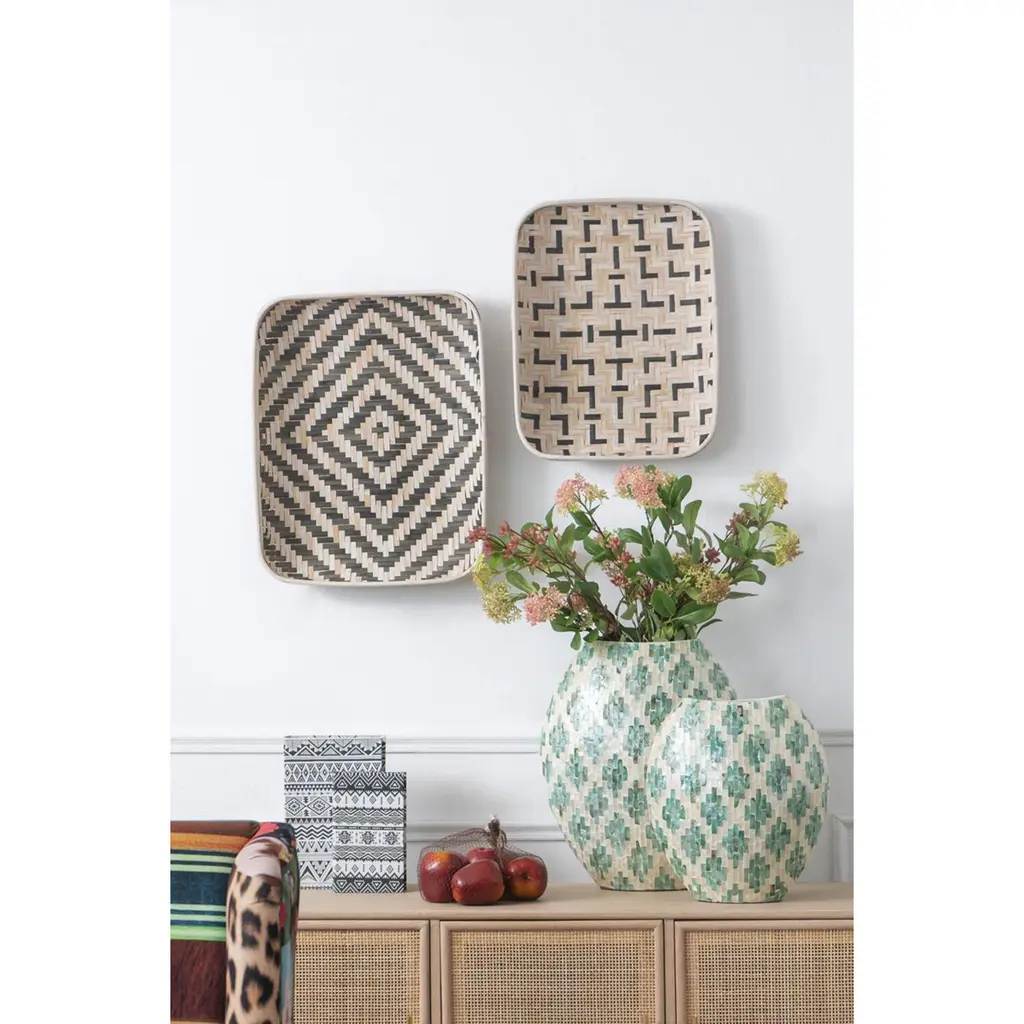 With a diamond pattern running along its petite green and tan frame, this Capiz vase is an accent piece that cant be missed. The oval shape and Capiz inlay amplify the vases bohemian style, and the size allows it to serve as a centerpiece on a table or mantle. An elegant design that complements its contents and surroundings, ideal for a living room or foyer.