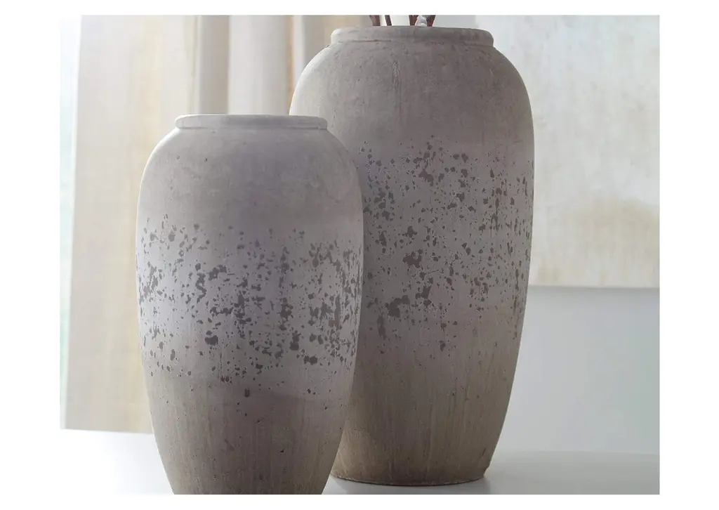 Is your home curated rather than simply decorated? Add another thoughtful piece into the mix with the Dimitra 2-piece vase set. Brown and antique cream painted ceramic has a unique weatherworn finish. Add fresh florals for a vintage-inspired look. Weight 14.000 lbs. (6.3kgs.)