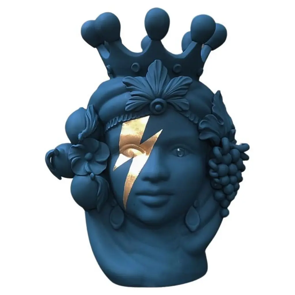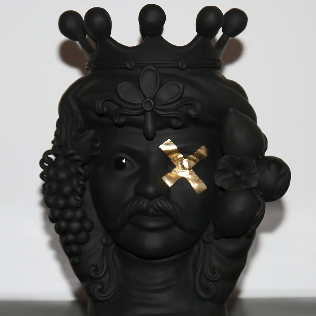 A striking piece of functional decor, this anthropomorphic vase of a Moor man is a testament to Sicily's rich crafting history and artistic patrimony. Entirely handcrafted and finished with a deep black glaze, this traditional statue is re-imagined and executed in a modern key that highlights the exceptional details, notably the intricate crown, luscious fruit-filled hair, and full lips. The details are accentuated by the hand-applied matte black glaze which effortlessly contrasts with the glossy finish used for the vase's eyes, enhancing its alluring quality.