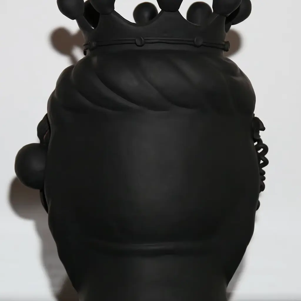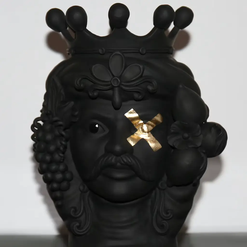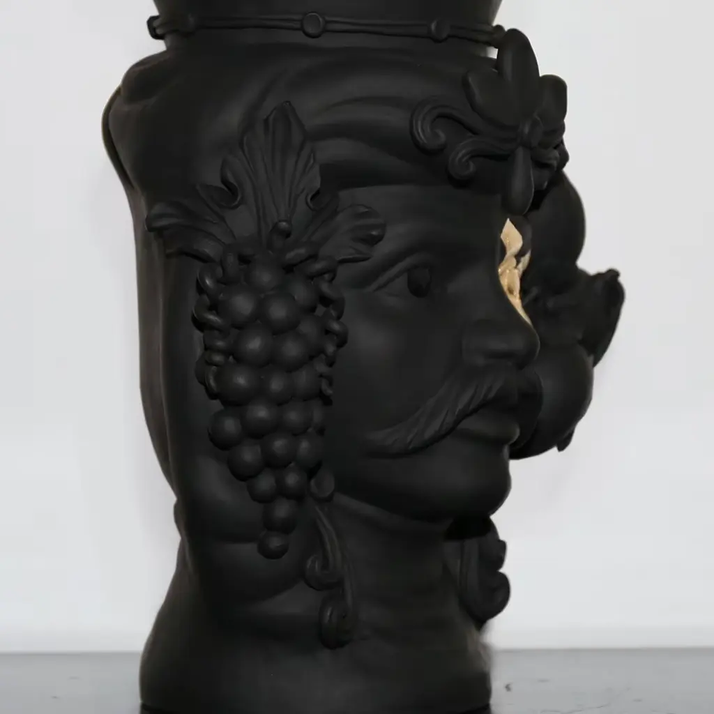 A striking piece of functional decor, this anthropomorphic vase of a Moor man is a testament to Sicily's rich crafting history and artistic patrimony. Entirely handcrafted and finished with a deep black glaze, this traditional statue is re-imagined and executed in a modern key that highlights the exceptional details, notably the intricate crown, luscious fruit-filled hair, and full lips. The details are accentuated by the hand-applied matte black glaze which effortlessly contrasts with the glossy finish used for the vase's eyes, enhancing its alluring quality. The vase cannot be filled with water.