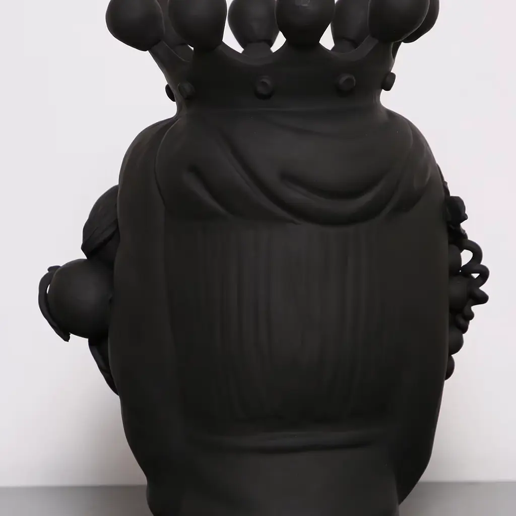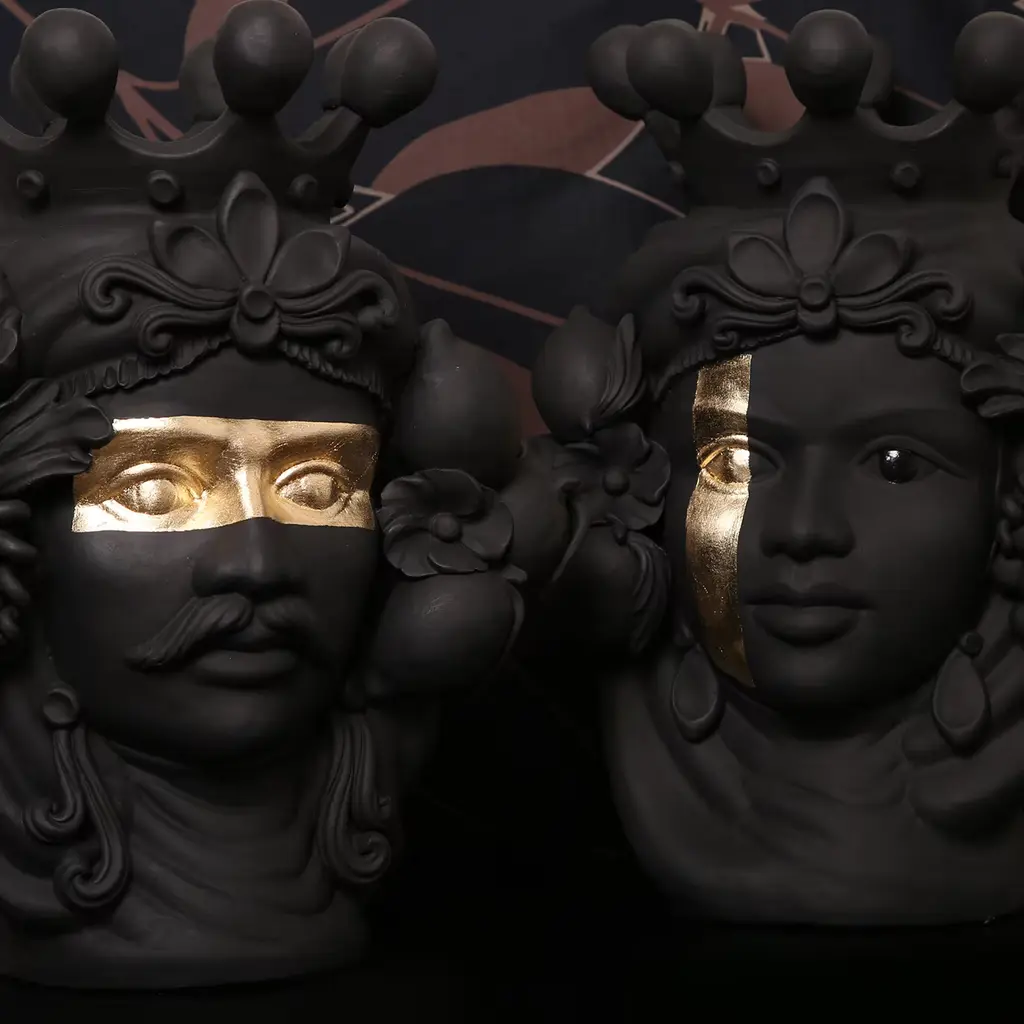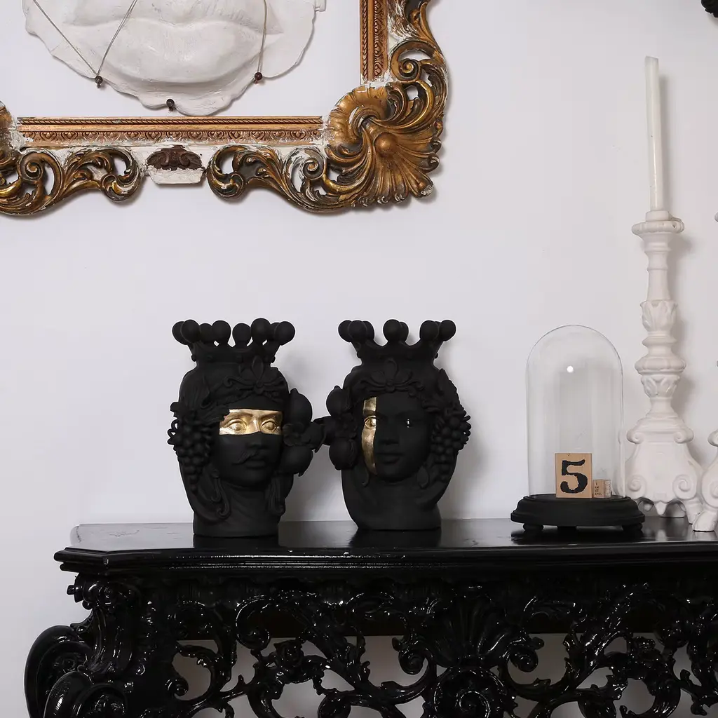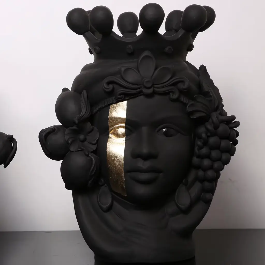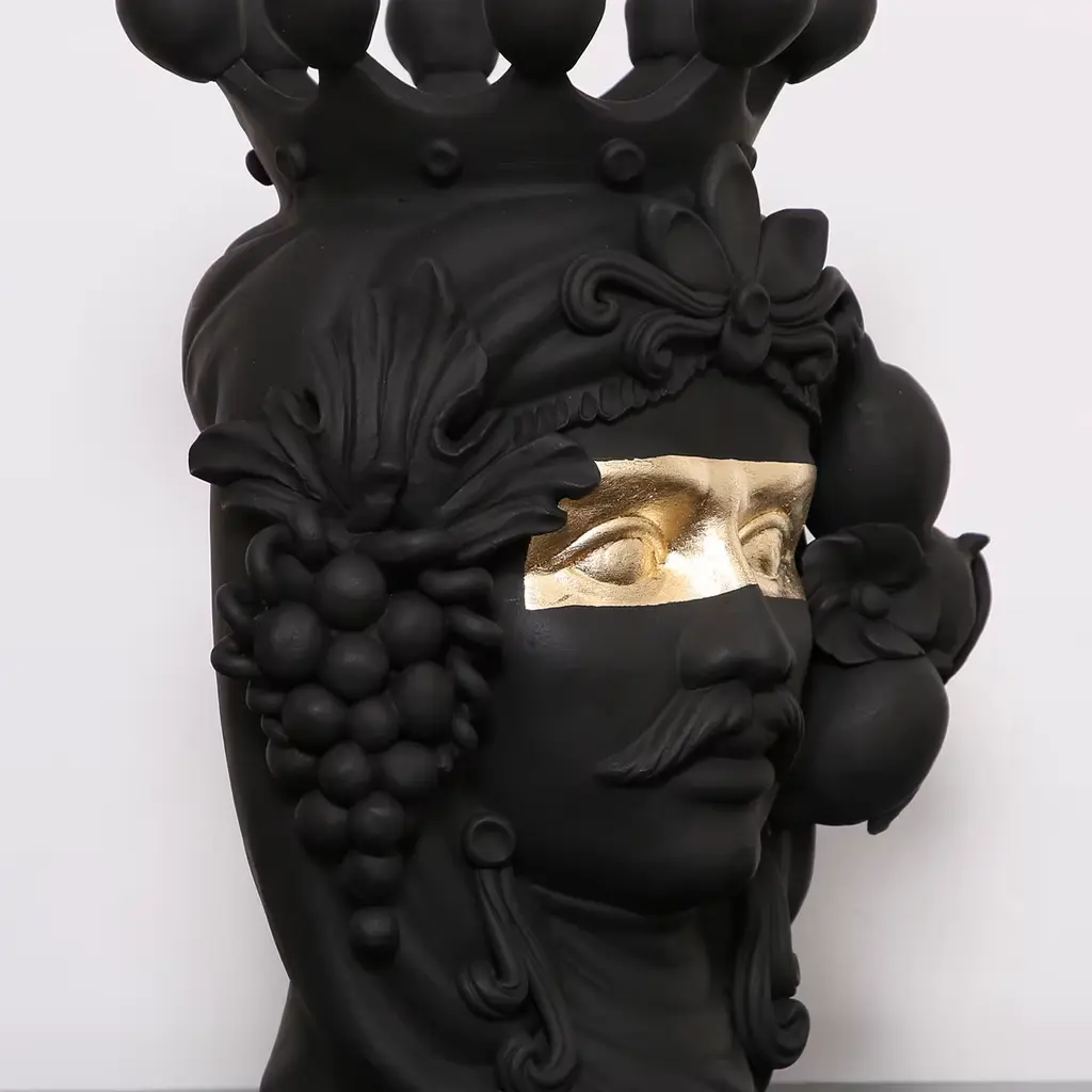 This anthropomorphic vase of a Moor man is entirely handmade of ceramic handpainted in a traditional matte black glaze. The beauty of this piece is revealed in the ornate decorative details in the stately headdress, crown, and luscious fruit-filled hair and the captivating gaze, highlighted by a bold panel of gold foil that reveals the striking eyes. The gold foid stands out against the matte black finish for enthralling visual contrast. The vase cannot be filled with water.