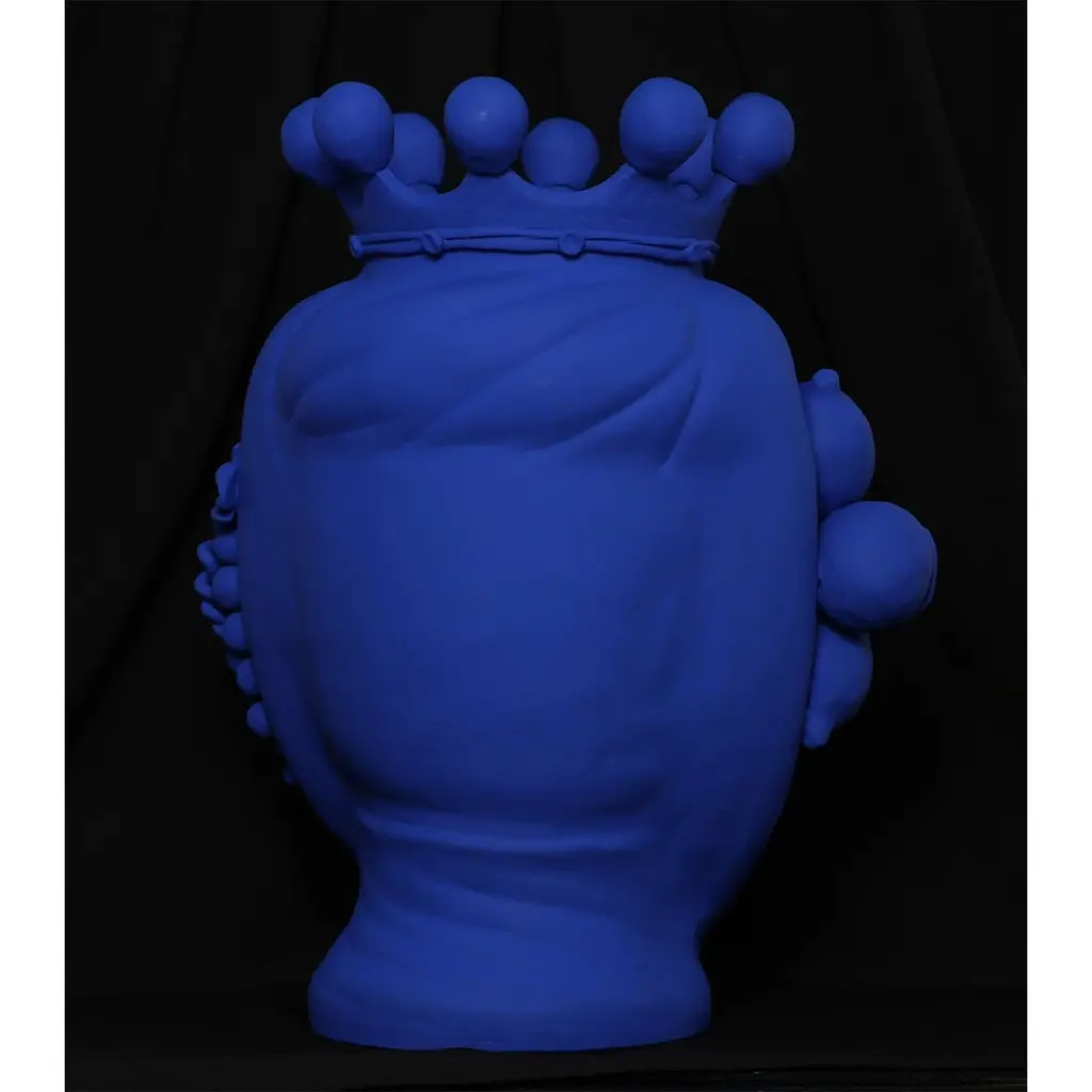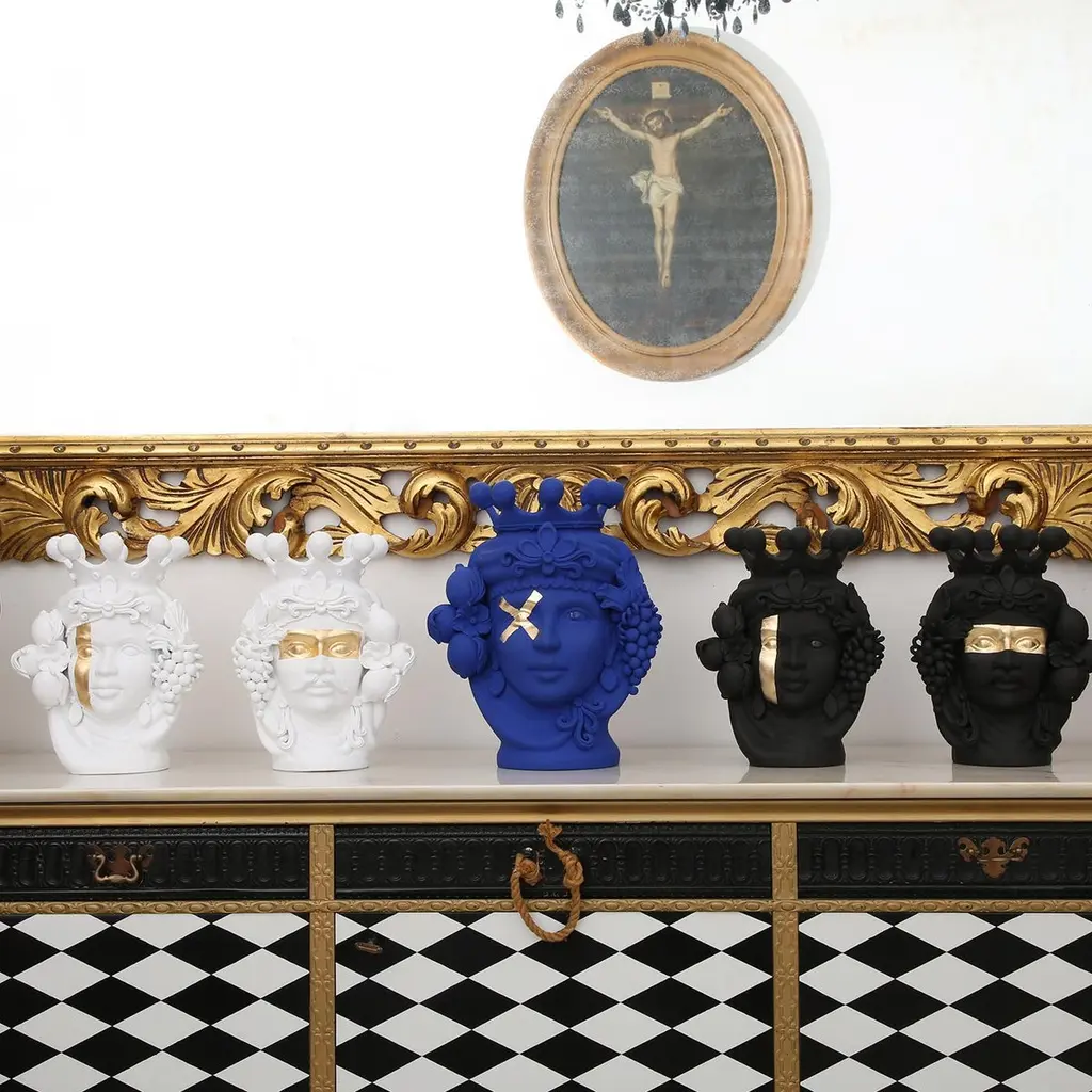Bold in its simplicity, this anthropomorphic terracotta vase is an iconic homage to Sicily's rich Moorish history. Depicting the stately elegance of a moor lady, the artistry of the piece is exemplified in the intricate detailing of the sinuous headdress, jeweled crown, drop pendant earrings, and delicate collier. The vibrant blue matte glaze breathtakingly contrasts with the gold foil X-shaped decoration on the woman's eye, enhancing the allure of the gaze. Just as the eyes are the windows to the soul, this vase will be the focal point of any interior decor.