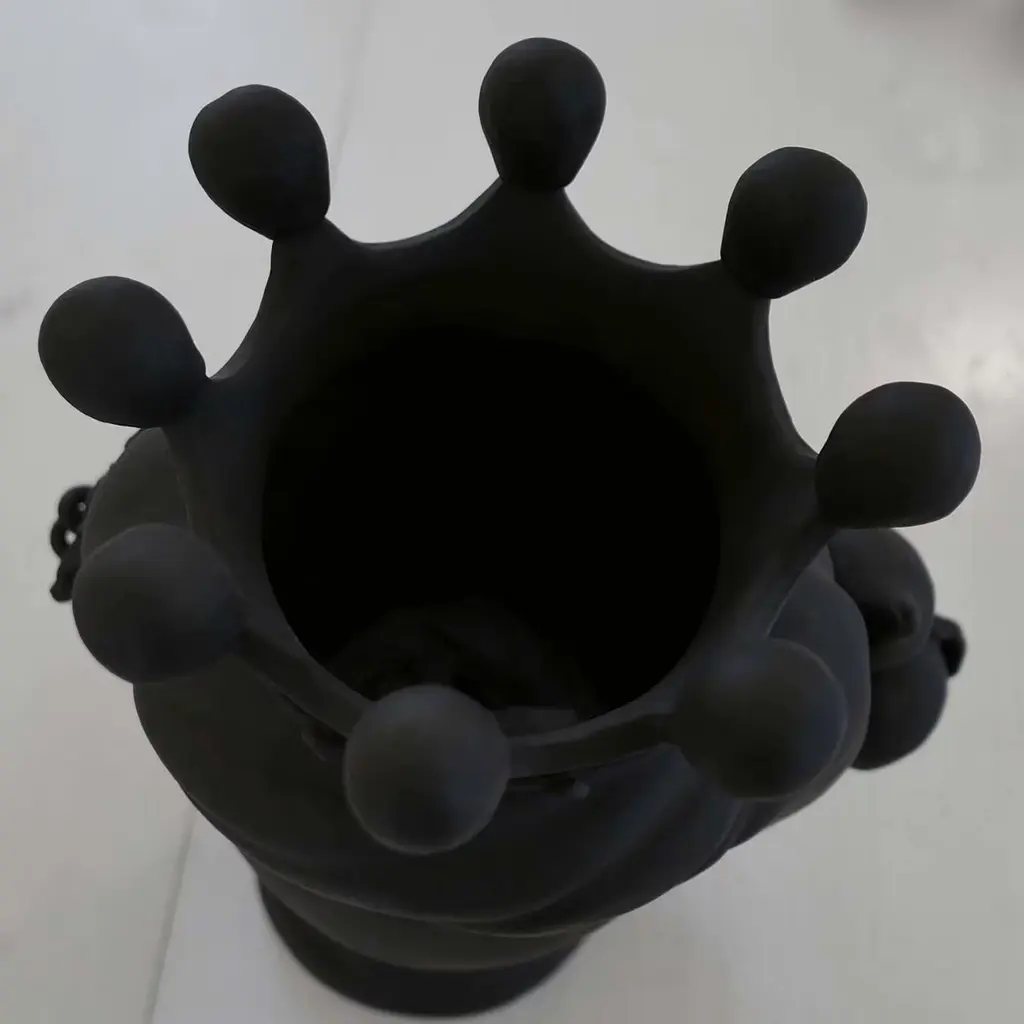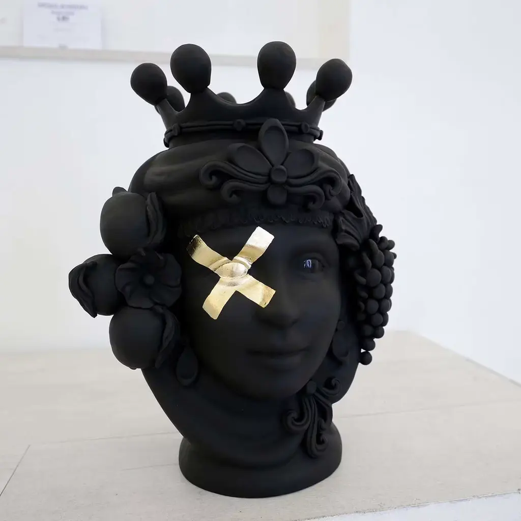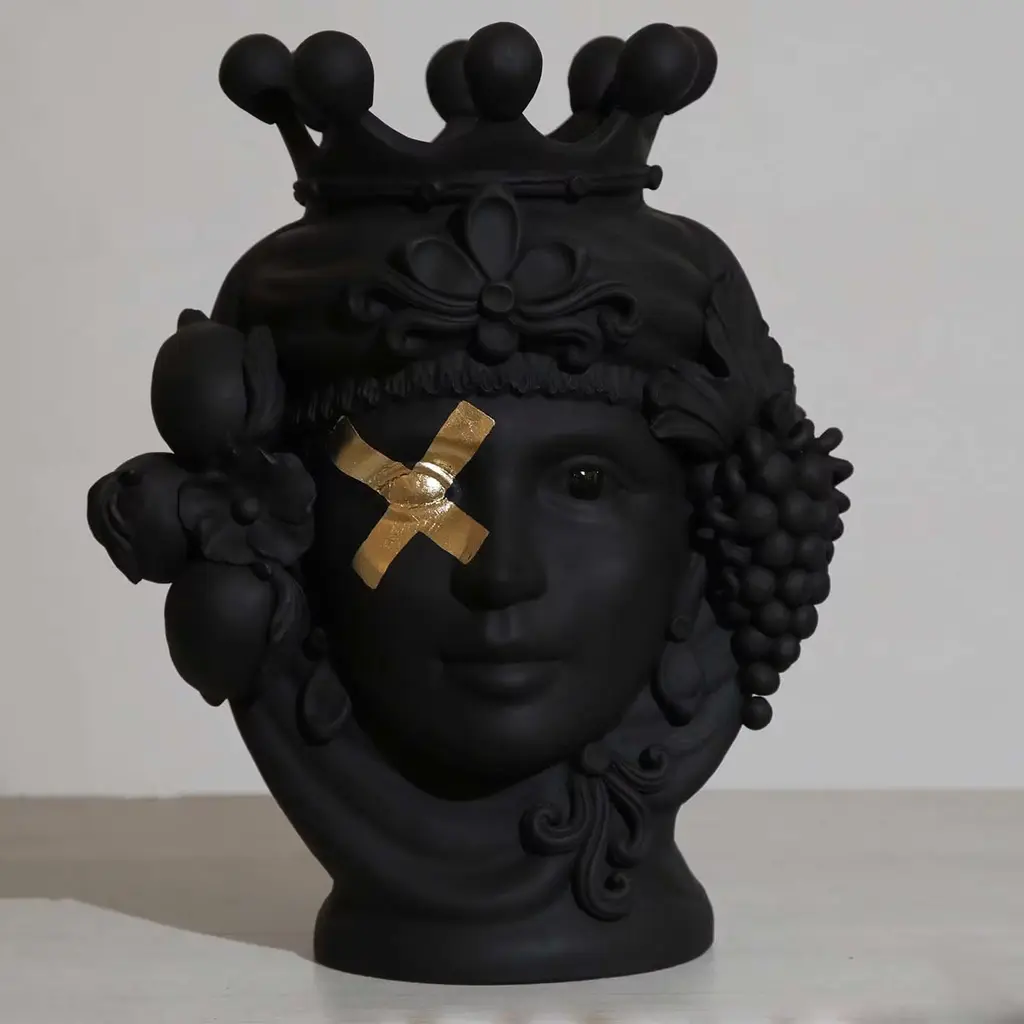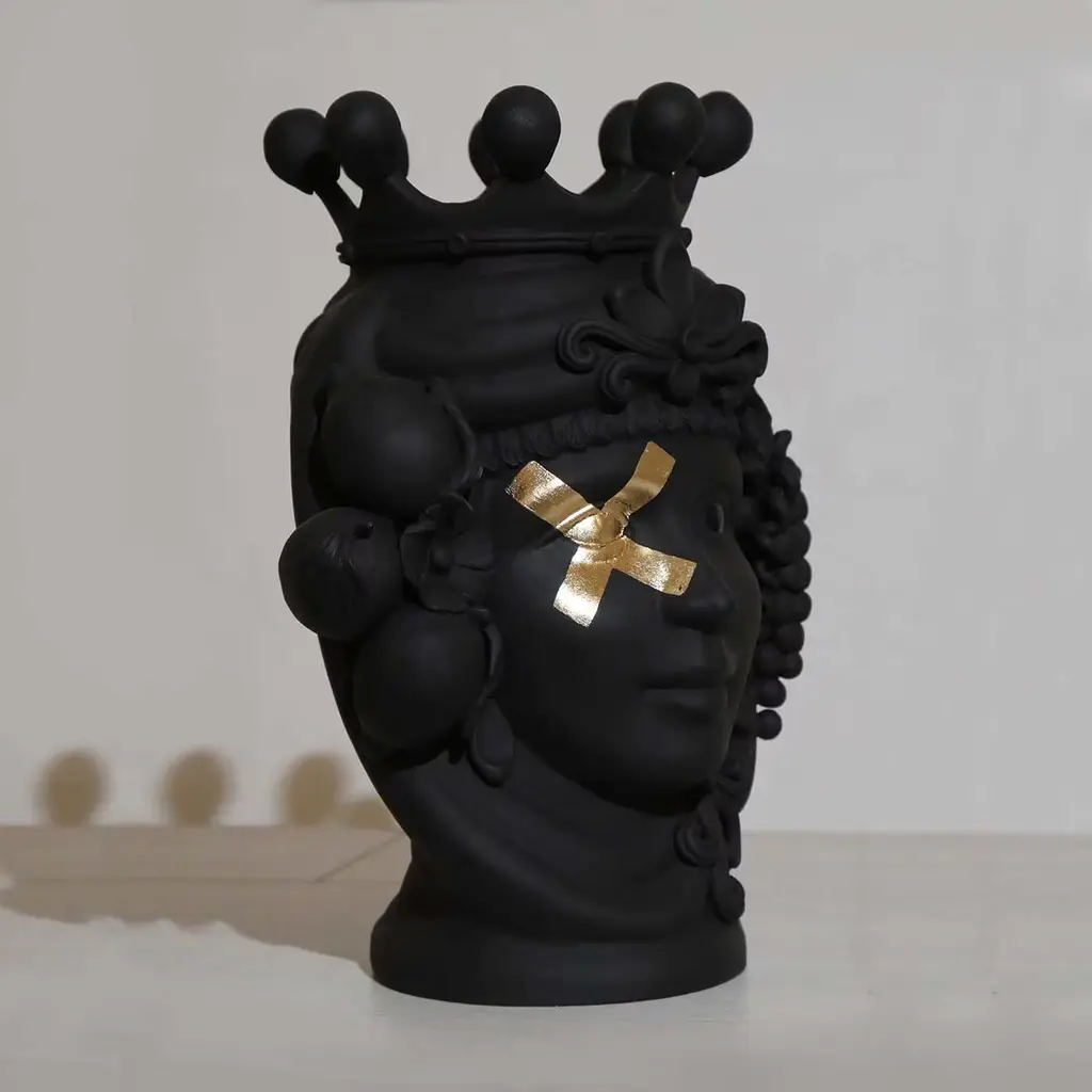 Skillfully handmade by sculptor Stefania Boemi, this anthropomorphic vase of a woman is a striking homage to Sicily's rich cultural traditions. The subject is drawn from Sicilian lore, a story of love and revenge between a Moor and a maiden dating back to the period of the Muslim conquest. Fashioned of terracotta with a black matte glaze, an X-shaped accent in gold leaf covers the right eye, emphasizing the captivating gaze. The richness of the natural pigments, reminiscent of Sicily's volcanic rocks, enhance the color intensity and meticulous sculptural details that make this piece unique. The vase cannot be filled with water.