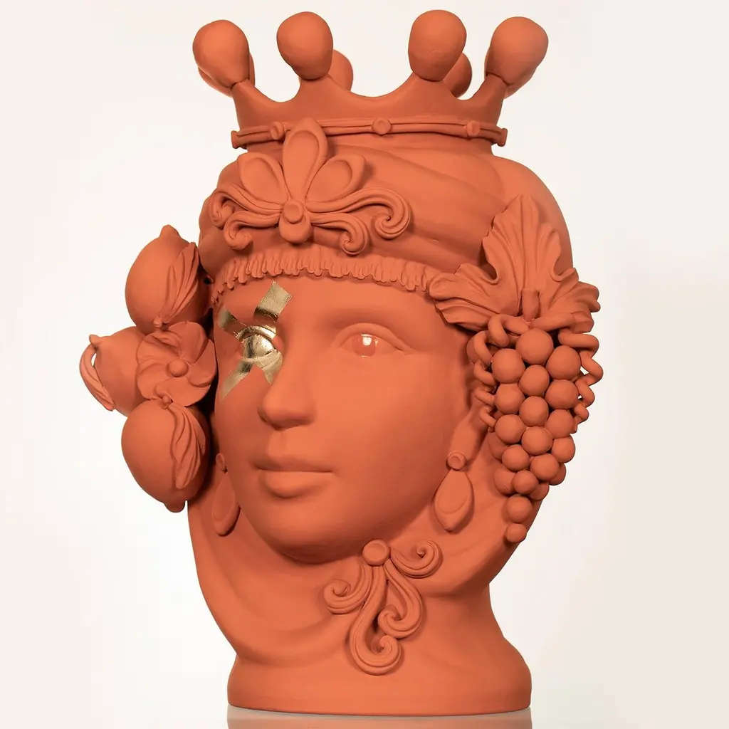 This unique work of art is sure to make a statement in an eclectic or modern decor, where it will be an ideal vessel to display floral compositions or as a statement sculpture. Its design is inspired by the Moorish-inspired sculptures in Sicilian ceramic tradition. The delicate features of the woman's crowned head are accented with flowers and fruit that are handcrafted and rendered with naturalistic details. Its splendid volumes are painted with a rich orange color, while one of the expressive eyes are marked with a gold leaf cross.