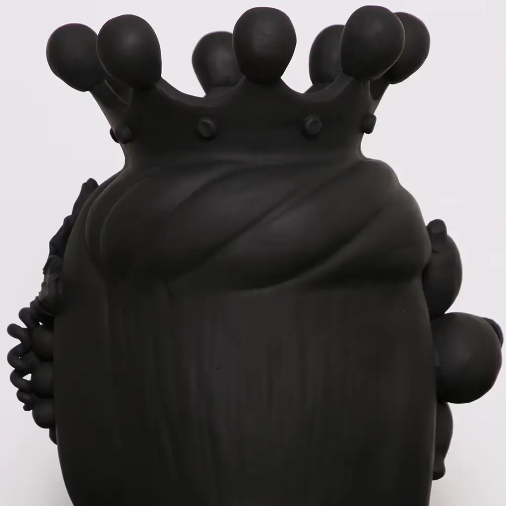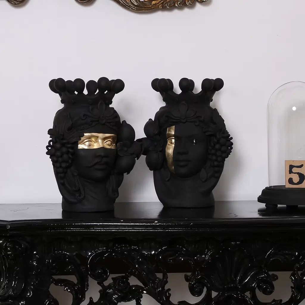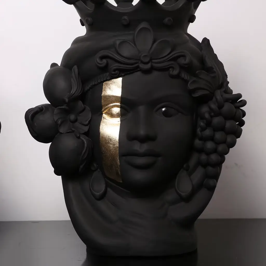 A captivating ode to traditional craftsmanship and modern sensibility, this anthropomorphic vase of a Sicilian woman recalls the grandeur of Sicily's Arab domination. Crafted with care by master ceramicist Stefania Boemi, this piece is hand glazed in a deep black matte hue and boasts an expressive visage with an ornate headdress and crown flanked by locks of hair intertwined with Sicilian lemons. One of the eyes features a gold foil band running vertically down the face, striking touch, emphasizing the beauty of the woman's gaze. The vase cannot be filled with water.