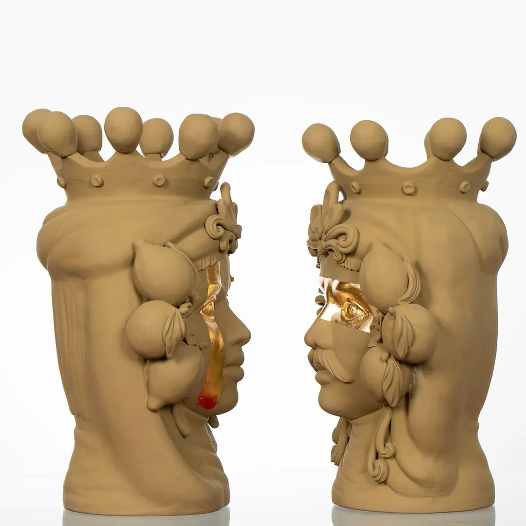 A stunning work of art, this sculpture of a Moorish woman's head features a crown and a rich decoration of flowers and fruit. This design is a modern interpretation of the traditional Moor head, an iconic decorative motif in Sicilian art that dates back to the Arab conquest of Sicily in the 9th century. The artist has finished the piece in matte white with the insert of gold leaf to mark vertically one side of the face. This superb vase can be displayed with or without flowers, as a one-of-a-kind decoration in a contemporary or eclectic home.