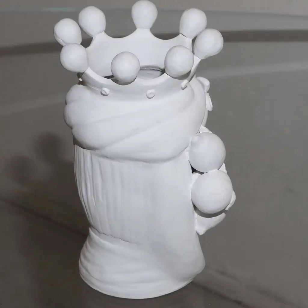 Distinguished for its deft use of sculptural details and simple colors, this handmade head vase will add dramatic flair to any kitchen, living room or entryway decor. This sculpture of a woman boasts a flawless white complexion framed by a supple grape, floral locks of hair and a regal crown. The subject, drawn from a Sicilian legend from the Muslim conquest, is re-imagined with a modern touch and crafted of terracotta with a matte white glaze that is accented by the bold gold leaf stripe running vertically down the face, emphasizing the beauty of the gaze. The vase cannot be filled with water.