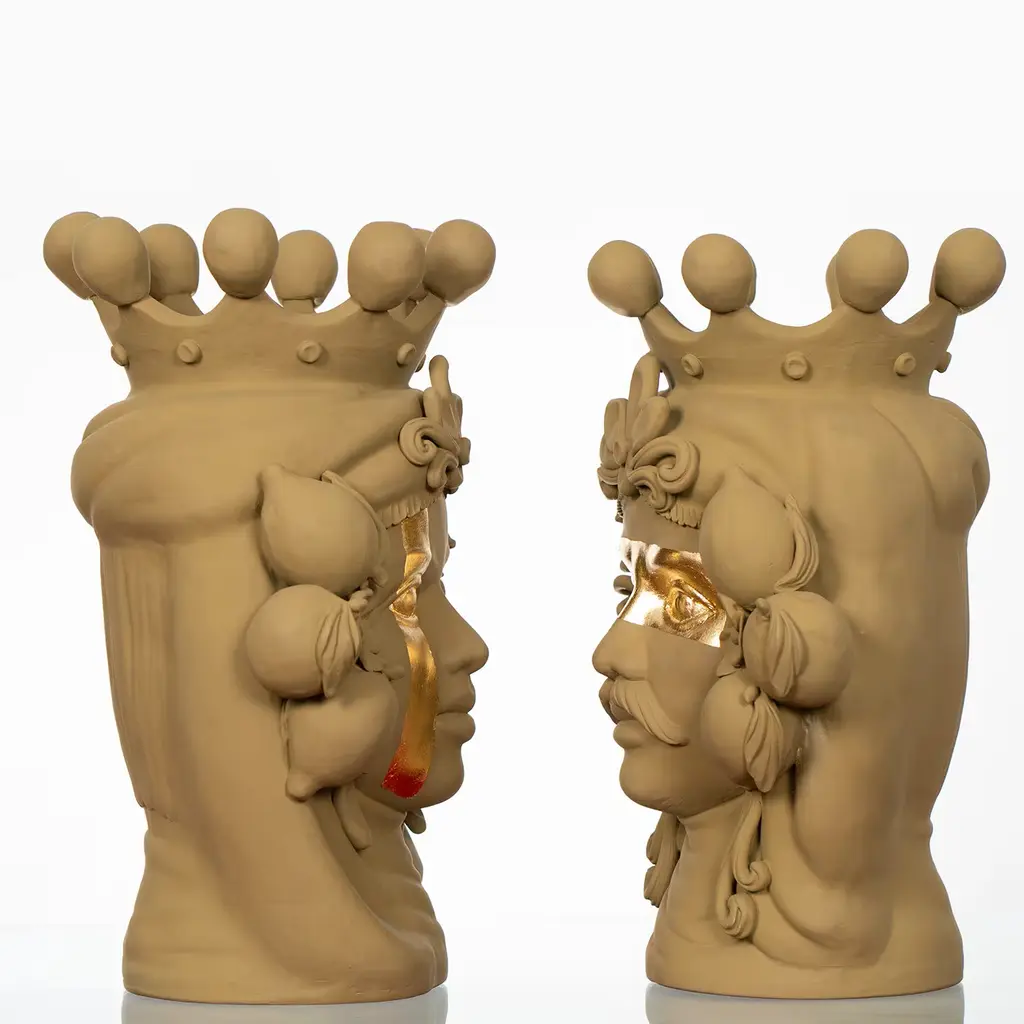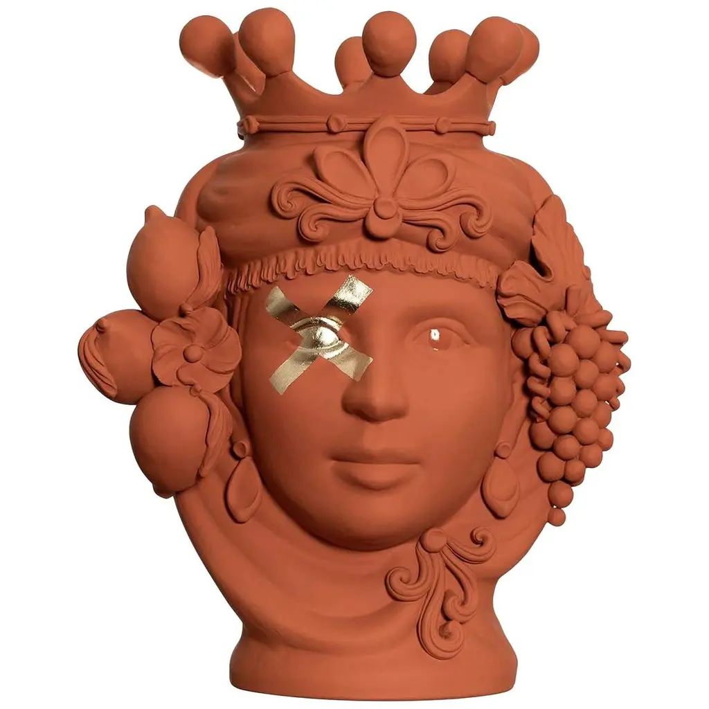 A stunning work of art, this sculpture of a Moorish woman's head features a crown and a rich decoration of flowers and fruit. This design is a modern interpretation of the traditional Moor head, an iconic decorative motif in Sicilian art that dates back to the Arab conquest of Sicily in the 9th century. The artist has finished the piece in matte white with the insert of gold leaf to mark vertically one side of the face. This superb vase can be displayed with or without flowers, as a one-of-a-kind decoration in a contemporary or eclectic home. The vase cannot be filled with water.