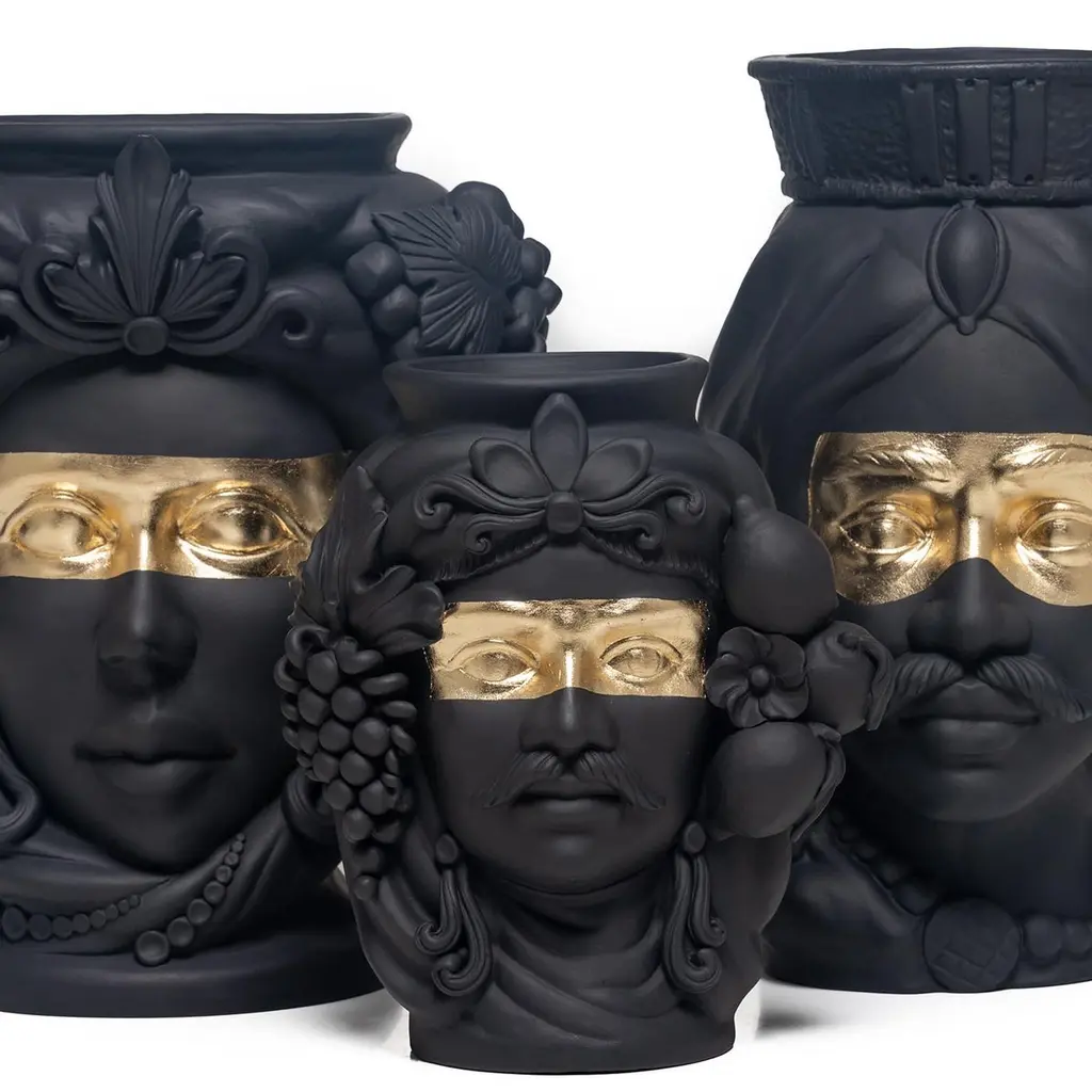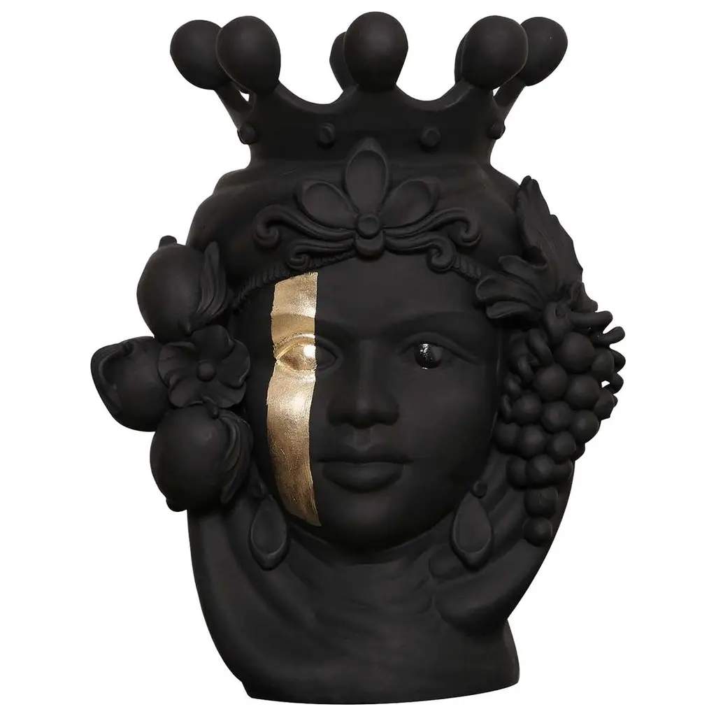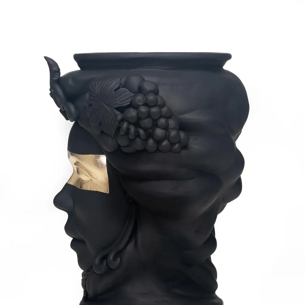 The grandeur of Sicily's Arab domination is celebrated in this anthropomorphic terracotta vase that depicts a Sicilian woman handcrafted by master ceramicist Stefania Boemi. The ceramic is hand-glaze in a deep matte black that enhances the expressive visage of the woman and her ornate headdress and crown, from which locks of hair are intertwined with Sicilian lemons. A band of gold foil runs horizontally across her eyes, a striking detail that emphasizes her intense gaze.