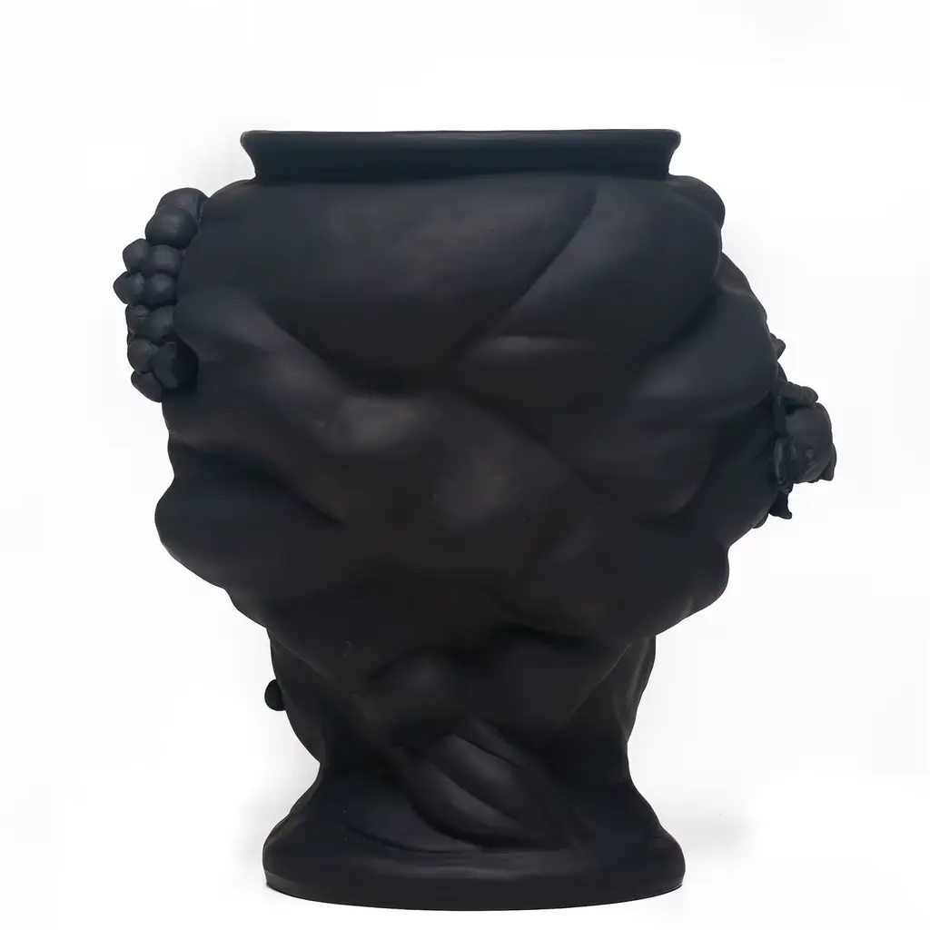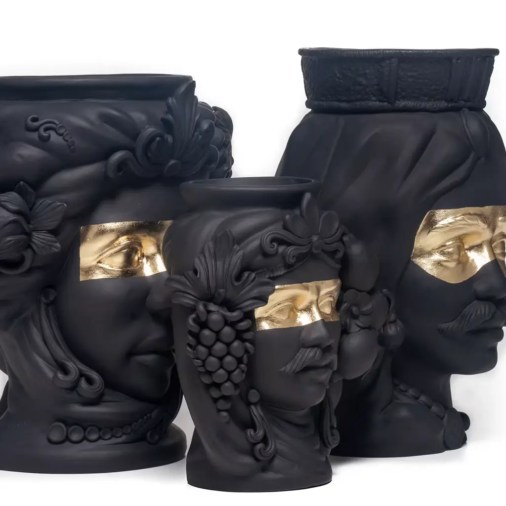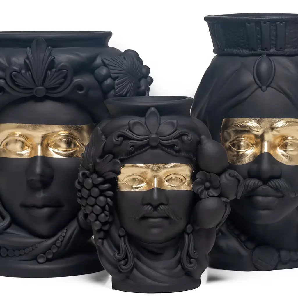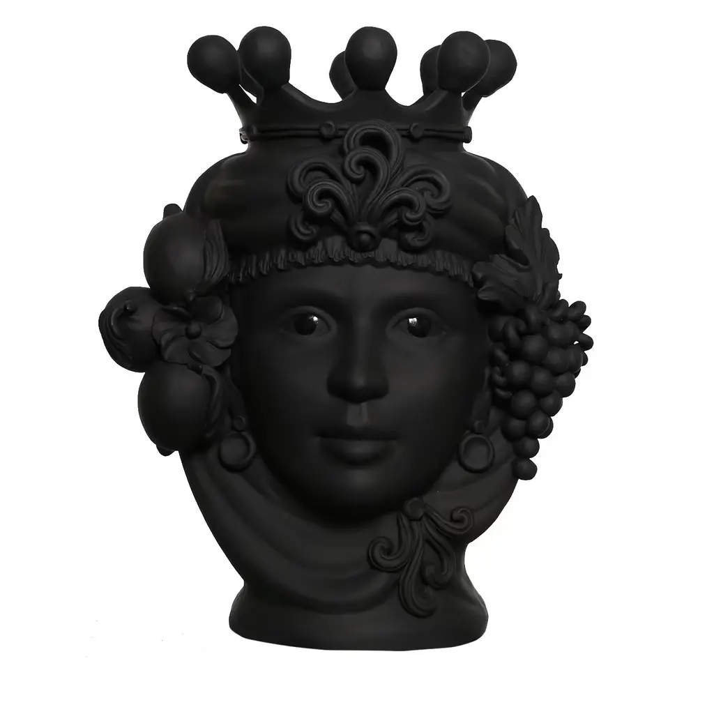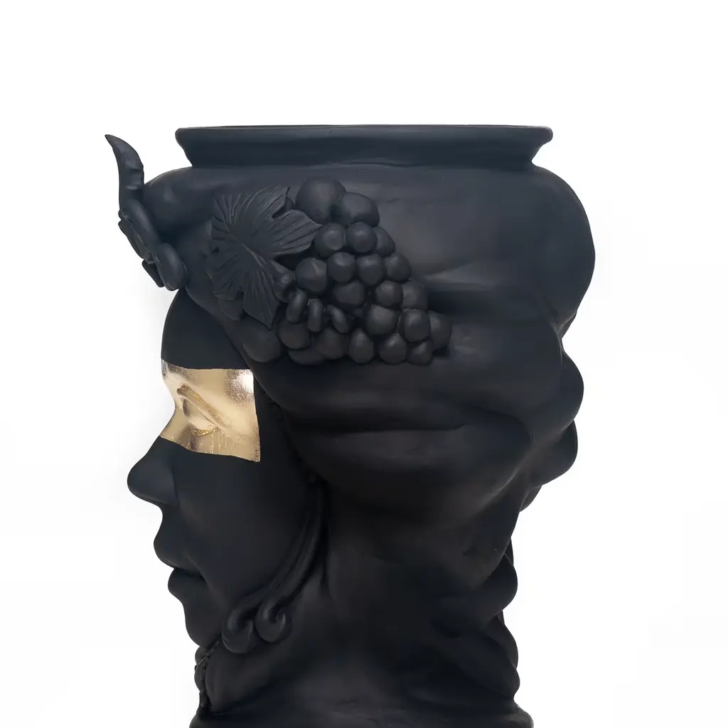 The grandeur of Sicily's Arab domination is celebrated in this anthropomorphic terracotta vase that depicts a Sicilian woman handcrafted by master ceramicist Stefania Boemi. The ceramic is hand-glaze in a deep matte black that enhances the expressive visage of the woman and her ornate headdress and crown, from which locks of hair are intertwined with Sicilian lemons. A band of gold foil runs horizontally across her eyes, a striking detail that emphasizes her intense gaze. The vase cannot be filled with water.
