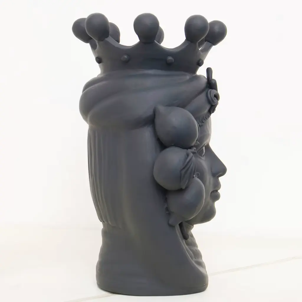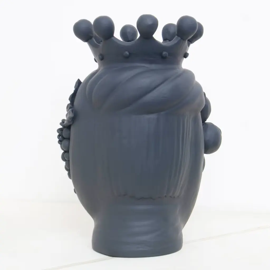 This anthropomorphic vase is made entirely by hand and painted in a dark gray matte monochrome tint, rich in natural pigments and resin binders that provide intense color depth. Only the eyes are glazed so they stand out, emphasizing the beauty of the gaze. The piece is inspired by ancient Sicilian legends of love and revenge between a Moor and a Maiden. The vase cannot be filled with water.