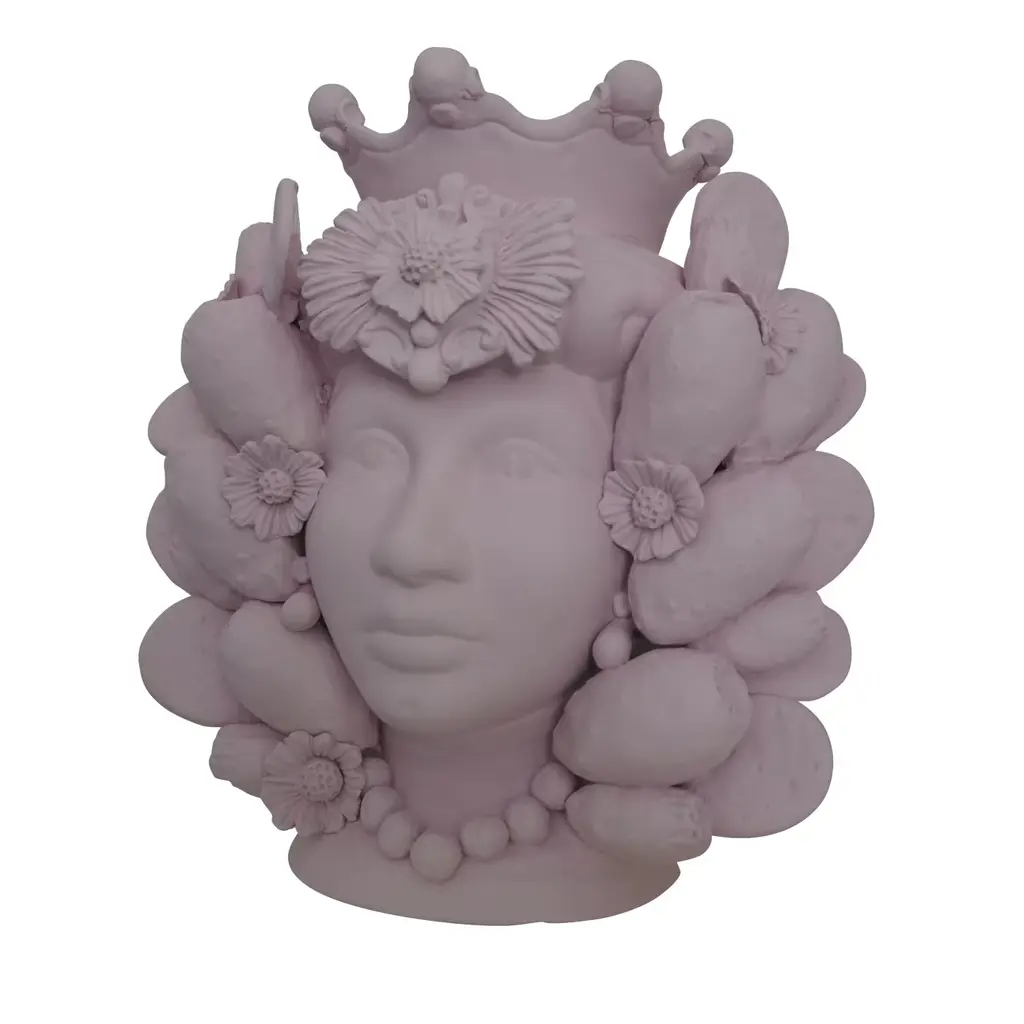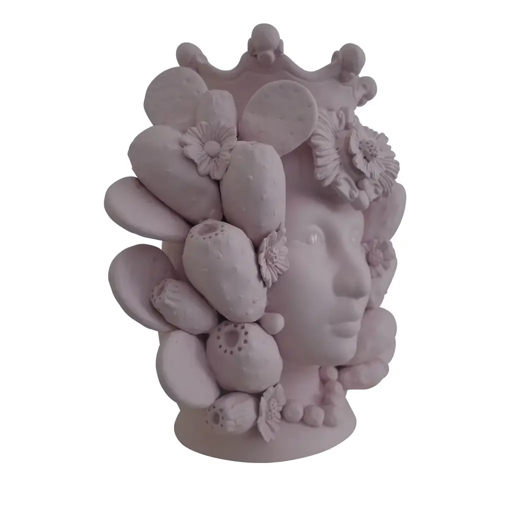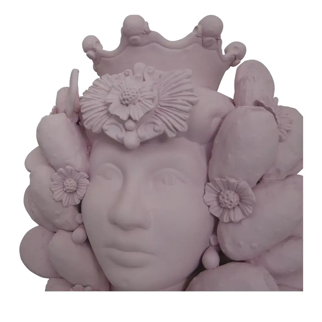 This anthropomorphic vase is made entirely by hand and painted in a light pink matte monochrome tint, rich in natural pigments and resin binders that provide intense color depth. Only the eyes are glazed so they stand out, emphasizing the beauty of the gaze. The piece is inspired by ancient Sicilian legends of love and revenge between a Moor and a Maiden. The vase cannot be filled with water.