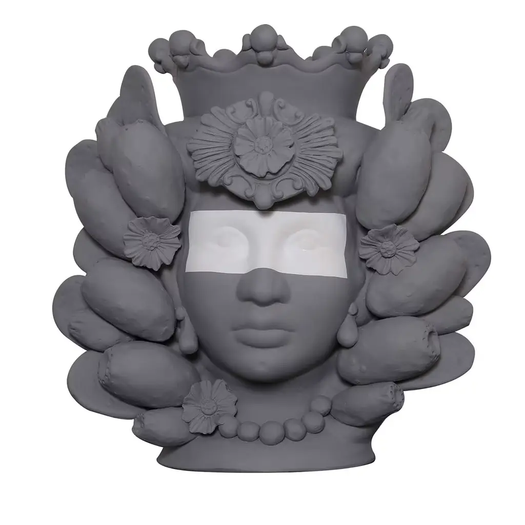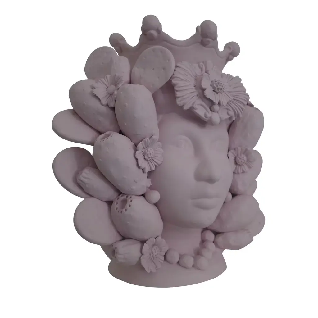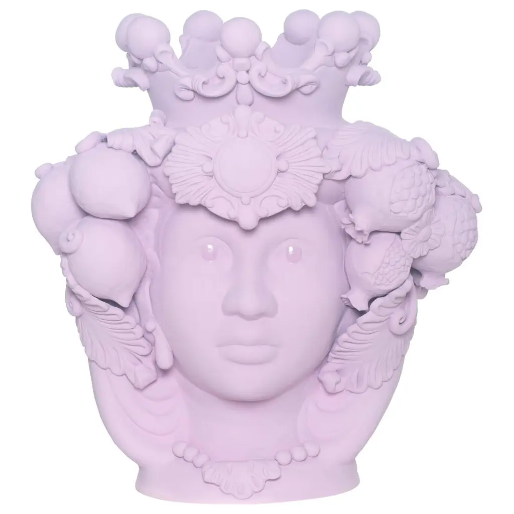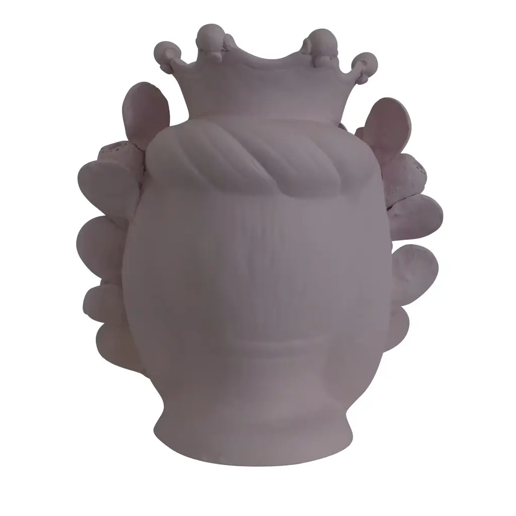 This anthropomorphic vase is made entirely by hand and painted in a light pink matte monochrome tint, rich in natural pigments and resin binders that provide intense color depth. Only the eyes are glazed so they stand out, emphasizing the beauty of the gaze. The piece is inspired by ancient Sicilian legends of love and revenge between a Moor and a Maiden. The vase cannot be filled with water.