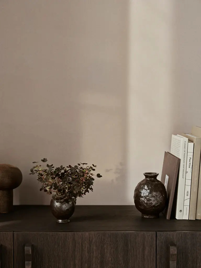The Doro Collection features a series of ceramic pieces that are distinguished by unique rounded shapes and a textured surface, each embodying rustic elegance in a harmonious ensemble of distinct personalities. The Doro Vase makes a statement whether displayed on its own or adorned with flowers, seamlessly blending functionality with artistic elegance.