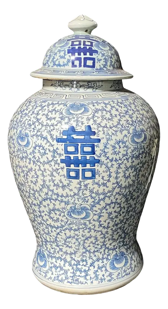 Superb pair of Chinese Double Happiness Coral and white covered ginger jars , The flat surface of the lid and the vases are ornamented with double Chinese character Shuang Hsi or double joy, on a background of sweet pea foliage. No maker' mark excellent condition