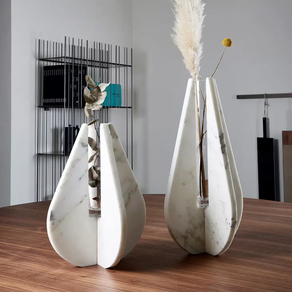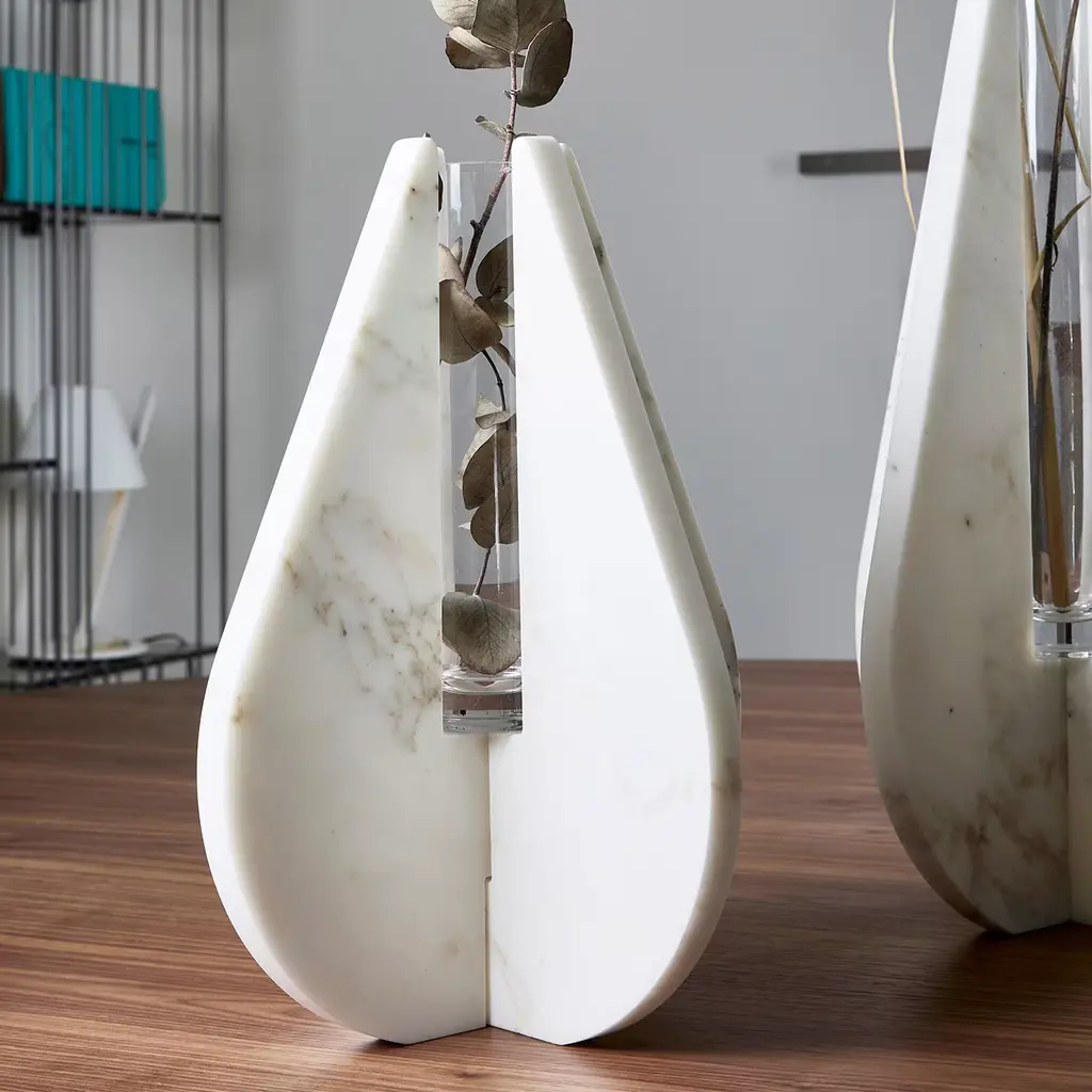 The sturdiness of white Carrara marble and the evanescence of a water drop inspired the sublime design of this vase from the Drop Collection. Equally superb on its own or filled with flowers, it consists of two interlocking marble elements with curved profiles and cut-out details for a perfect fitting of the cylindrical glass vessel. Designed by Alessandra Grasso.