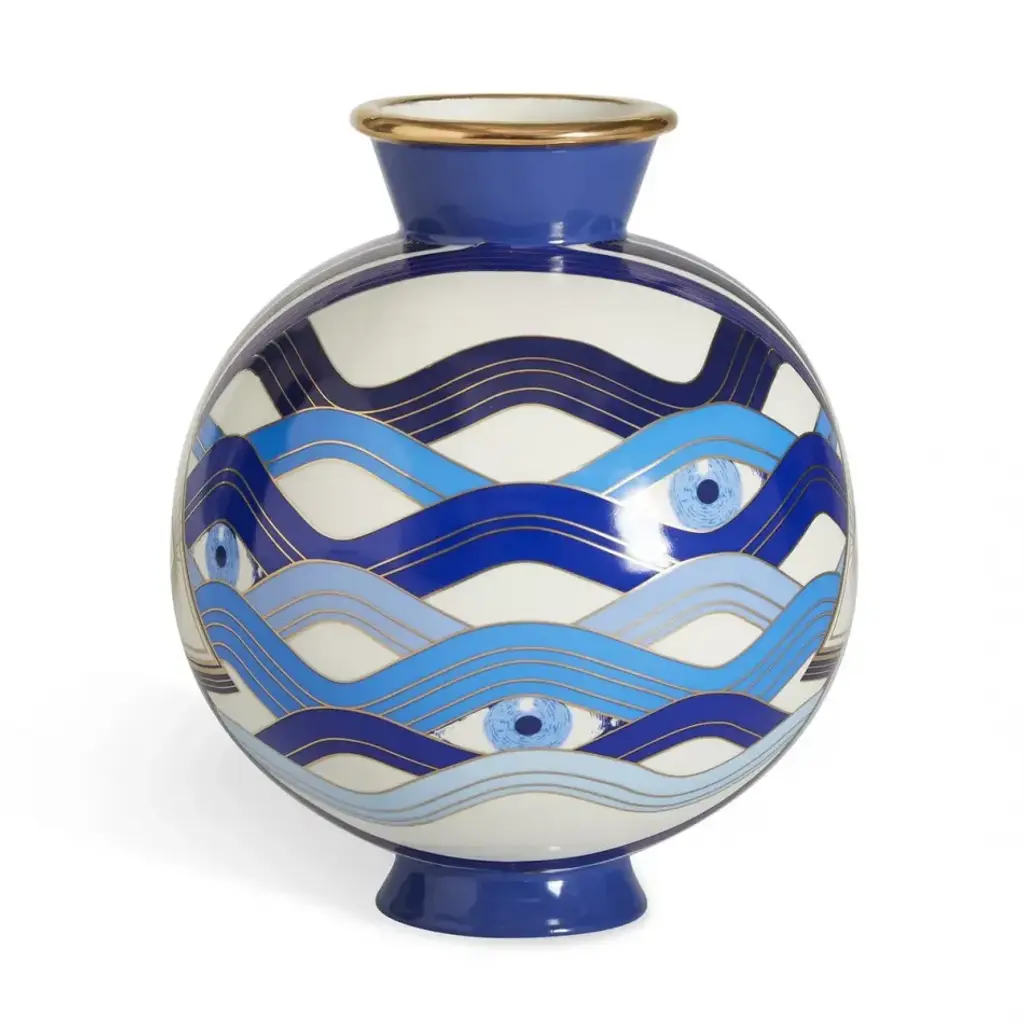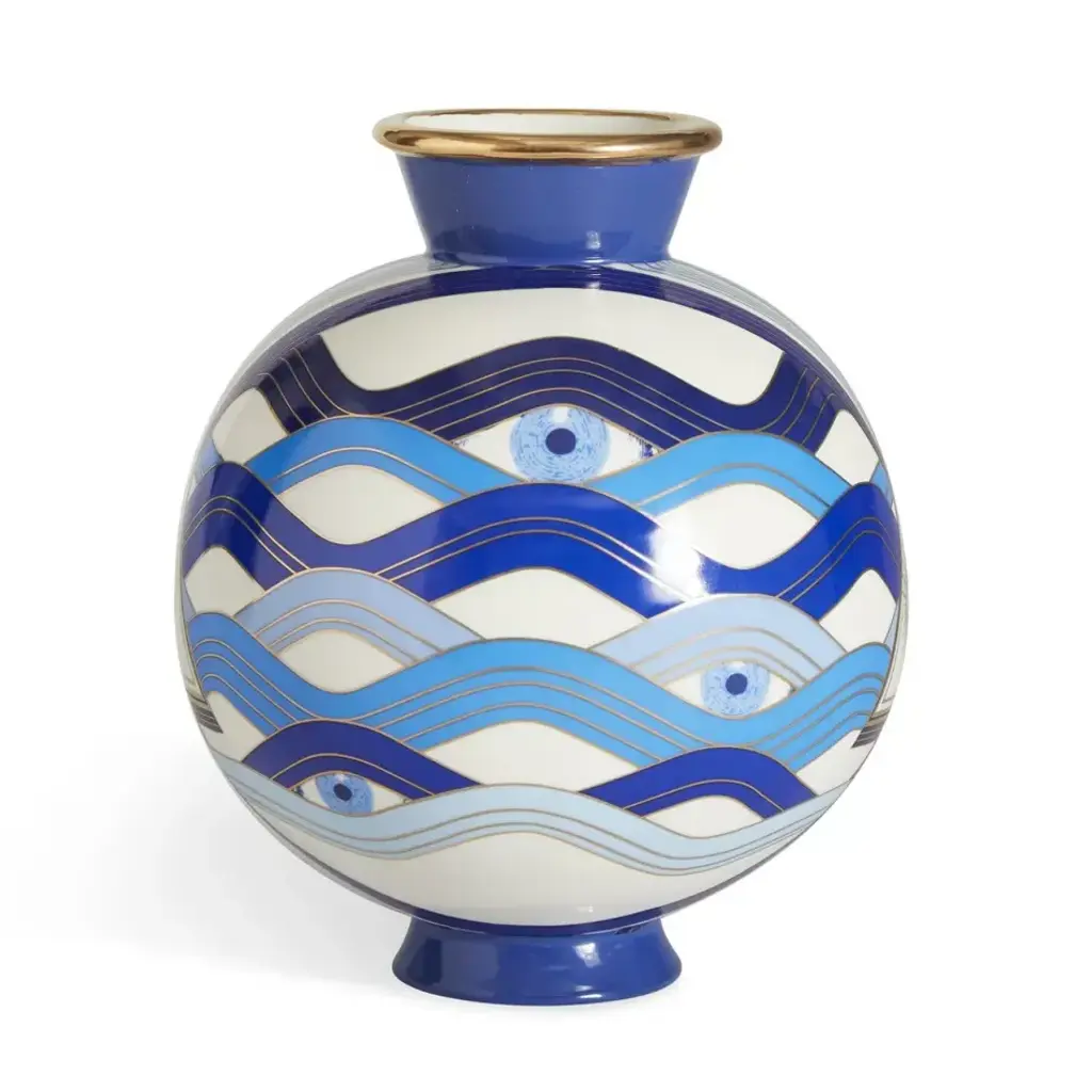 Dream Catchers. Expand your horizons with a dreamy third-eye mindscape rendered in Delft-inspired blues and accented with real sparkly gold. High-fired porcelain elevates the experience. With or without flowers, our Druggist Eye Vase is a surreal addition to your table, shelf or mantel.