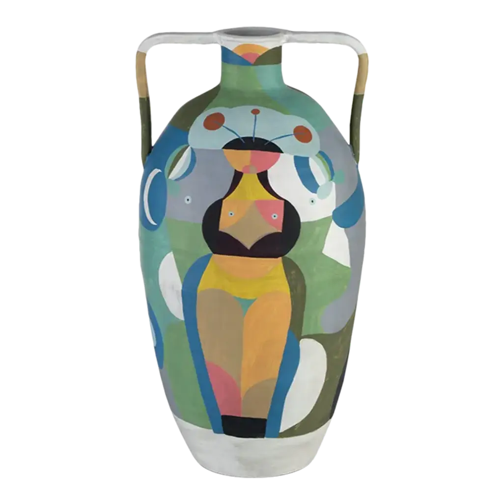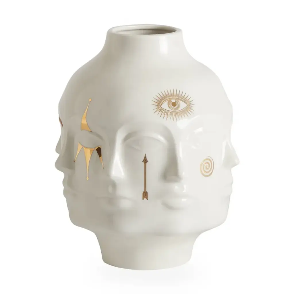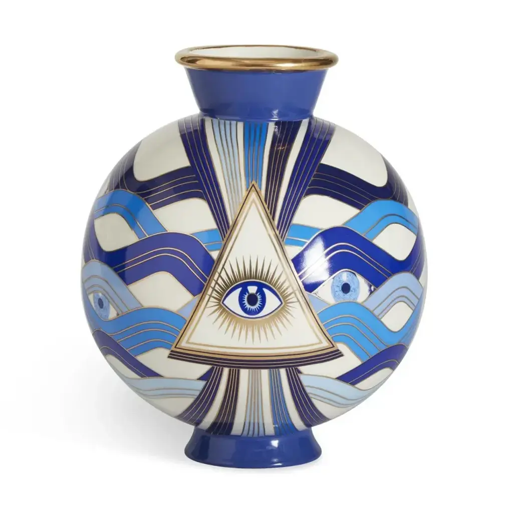 Dream Catcher. Expand your horizons with dreamy third-eye mindscapes rendered in Delft-inspired blues and accented with real sparkly gold. High-fired porcelain elevates the experience. Our Druggist Eye Vase is wrapped in unique designs—rotate to refresh your view. A surreal addition to your table, shelf, or mantel. Style it with our other Druggist pottery and create your own dreamscape.