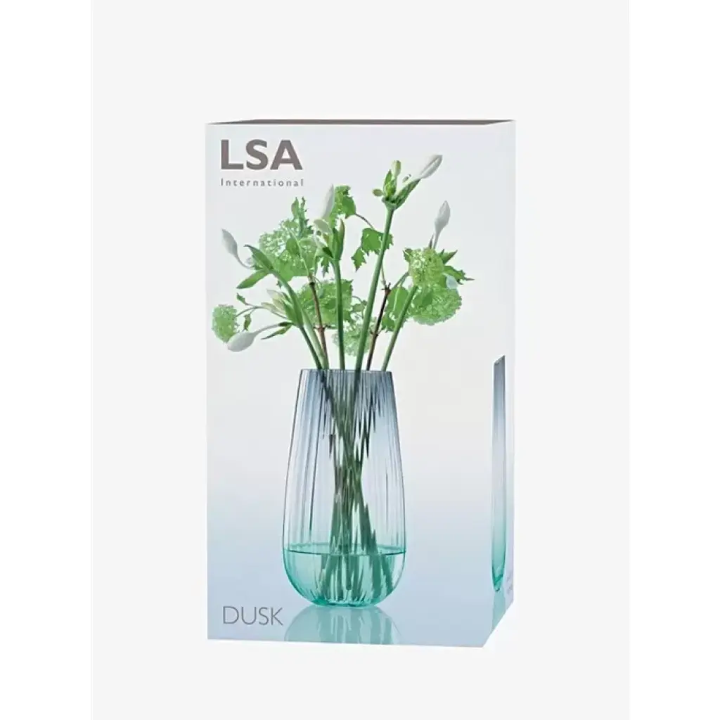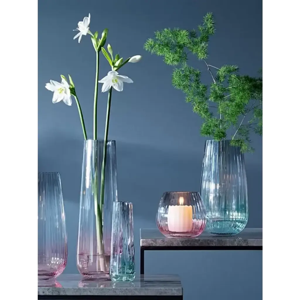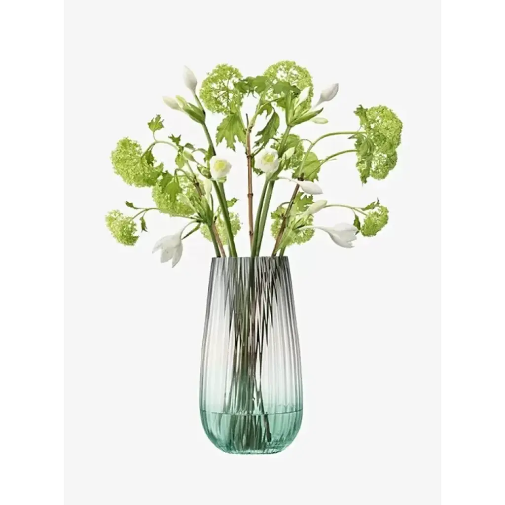 A mouth-blown vase with a fluted texture, hand painted by skilled craftspeople with green and grey lustre. The sheer colours diffuse towards the centre of each teardrop-shaped piece. Mouth-blown glass Finely-fluted texture Hand painted with two complementary lustre colours