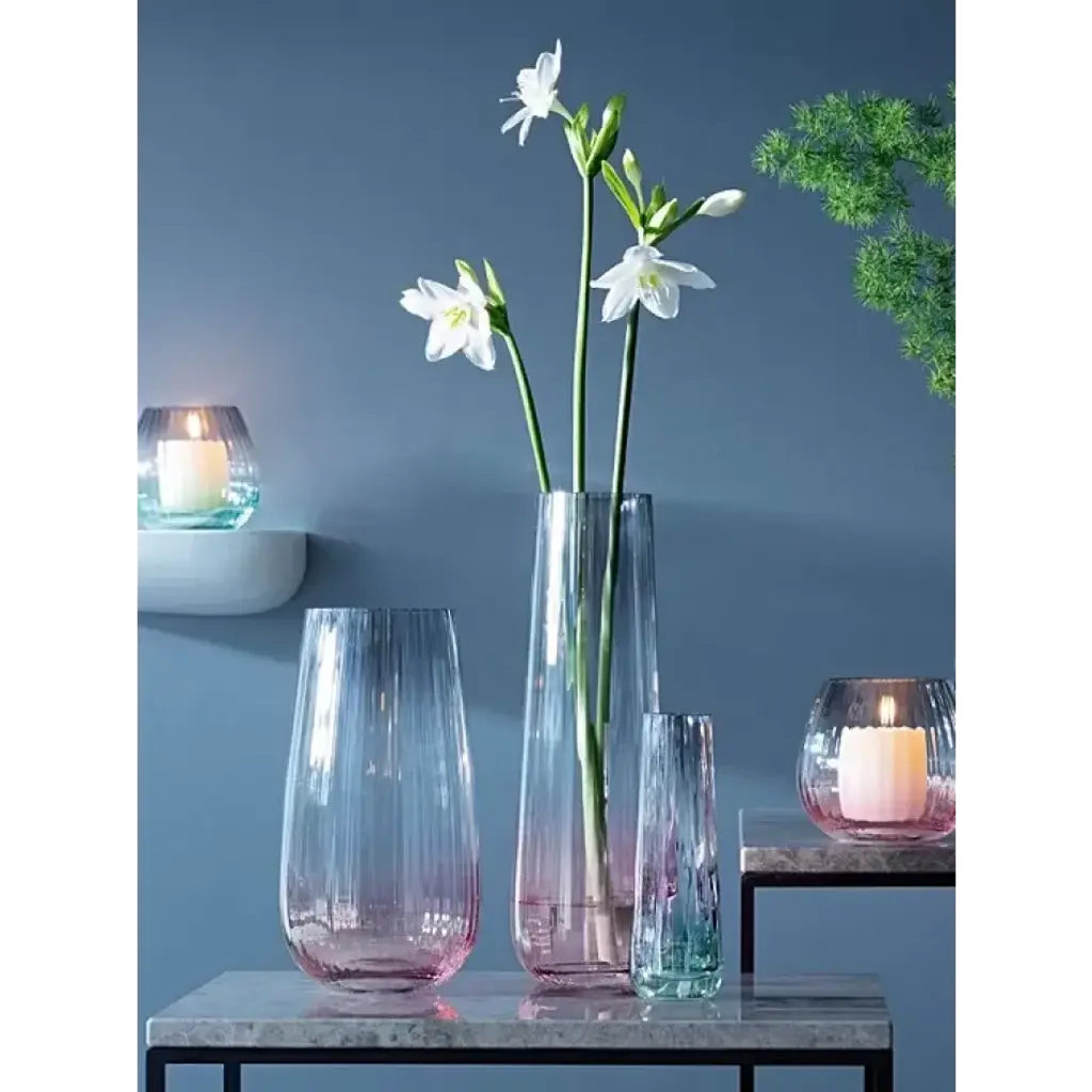 A mouth-blown vase with a fluted texture, hand painted by skilled craftspeople with pink and grey lustre. The sheer colours diffuse towards the centre of each teardrop-shaped piece. Mouth-blown glass Finely-fluted texture Hand painted with two complementary lustre colours