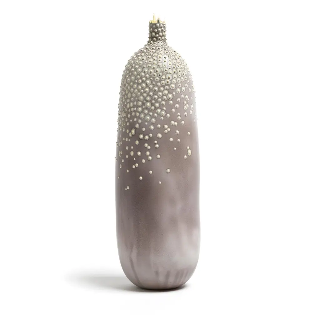 Dust Dubos vase by Elyse GrahamDimensions: W 14 x D 14 x H 38 cmMaterials: Plaster, ResinMolded, dyed, and finished by hand in LA. customizationAvailable.All pieces are made to orderOur Microbe Collection is inspired by the unique galaxy of microorganisms living within each of us. We created a technique for dying and stippling each vase that evokes the nature of microbes as they grow and colonize .Each vase is hand-cast with hydrocal plaster inside of a unique balloon shape. The interior of each piece is poured with layers of resin, making it waterproof. Finally, each vase is hand-dyed with custom mixed pigments and finished with a unique pattern of dyed plaster protuberances. The exterior of each vase is sealed with a UV resistant acrylic coating.These vases are all handmade and will vary slightly in shape, Size, color and pattern.Founded in 2014 and based in Los Angeles, the Elyse Graham Studio is a place where unusual materials and experimental processes are implemented to create a melding of art and object. We design by making—with an emphasis on capturing the unique properties of the materials we use through exploration and innovation.Each piece we make is non-repeating and completely individual. We have intentionally designed every process we use — from how we mix our colors to how we cast our forms to highlight and celebrate the time-based, made by hand quality of our work. All of our pieces require a specific kind of care and attention at every level of production.At the core of our studio is our endless fascination with inviting the unknown into our work and exploring our passion for creating pieces that tell a story— about the materials they are made of, the artists who make them and the homes they live in. Each piece is a journey, come along with us.MEET OUR TEAMElyse Graham is the founder and creative director of the studio. Driven by Elyse’s unique vision of building a studio that fosters and emphasizes connection, play, and experimentation (of people, processes, and in turn the objects created and shared) our small team works closely and collaboratively on each project.Elyse received a BA in sculpture and semiotics at Brown University. After years of making sculpture and running a business in jewelry design, Elyse decided to merge her separate practices and redirect her attention toward collectible design in 2013. The creative trajectory of the studio is heavily influenced by Graham’s background in fine art, specifically her interest in process-driven and Material-based artwork. The studio’s vocabulary of shapes, patterns, and forms comes from a lineage of unconventional processes Graham has developed and built for working with plaster and resin.Graham shares her studio as well as her home with her husband, Lewis Mauk and their daughter, Eero.Miller Robinson is head of our production department. From pigmenting and casting materials for all of our products in plaster and resin to graphic and production design, they wear many hats in our studio. Miller joined our team in 2014 and has been an integral part of designing many of our experimental processes that have lead to the creation of our unique MetaMATERIAL.Like Elyse, Miller has a background in Material and process-oriented making, which led to an instant connection and collaborative understanding between the two. Miller received their BFA from Otis College of Art and Design with a focus on painting, installation, performance, and writing. Their individual art practice focuses on the preservation and potentialities of underrepresented histories and encompasses objects, garments, actions, tattooing, and books. Their personal work has been exhibited in Los Angeles at the Southwest Museum, Los Angeles Municipal Art Gallery, Heritage Square Museum, and with Los Angeles Contemporary Exhibitions (LACE), as well as HORESEANDPONY fine Arts in Berlin.Lewis Mauk is our studio and operations engineer. Working on facilities and production design as well as engineering and leading all of our large scale constructions and installations, Lewis’ unique set of technical skills gives form and structure to our studio’s unconventional ideas and processes. Lewis has been working behind-the-scenes since the creation of the studio but joined our team full-time in 2020.Consistent with the rest of our team, Lewis has a background in process-driven fine art and has extensive training in woodworking, printmaking, and photography. He received a MFA from CalArts and has worked across the fields of education and fabrication. Lewis’ combined interest in the creation of personal archives mixed with his commitment to sustainable life practices, has brought a focus and important emphasis on designing studio projects and processes that imagine ways to reduce and reuse studio Material fragments.