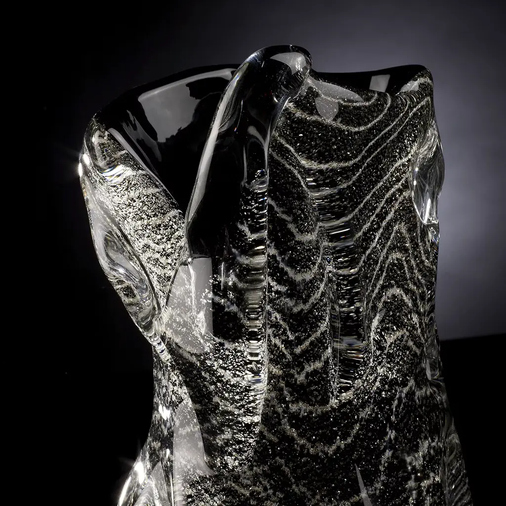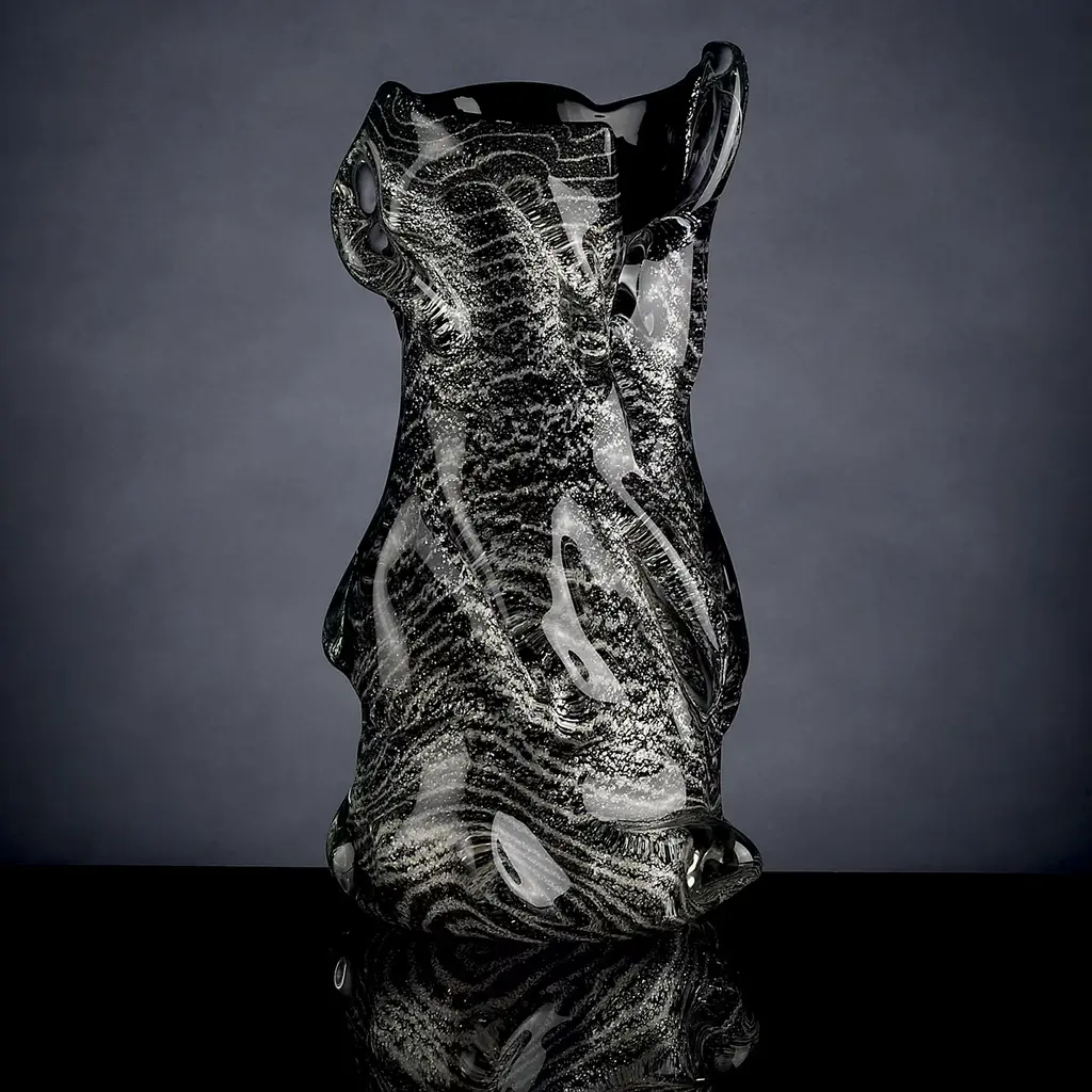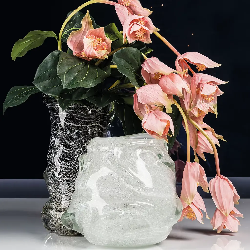 An ode to the endless variety of dynamic volumes molten glass can acquire, this singular decorative vase makes for a stunning solution to accent a minimalist decor of contemporary inspiration. The textural dynamism is enhanced by the glossy look that emphasizes the sinuous silvery stripes characterizing the exterior.