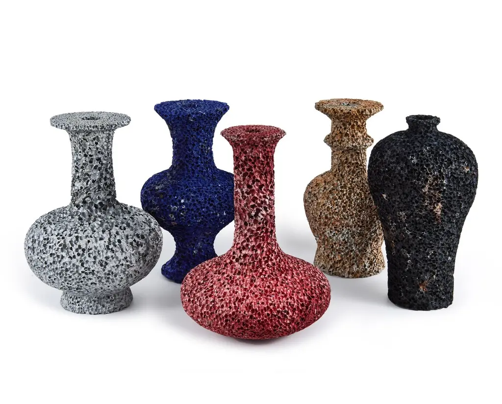 As a new phase of his exploration of working in the medium of aluminum foam, Michael Young has created a new series of vases for Gallery ALL. The Dynasty series will make its global debut at the fifth edition of Design Shanghai, from 14-17 March 2018. Young has been experimenting with the material for a number of years, and this new collaboration has resulted in a unique series of objects. Each vase is a formal representation of a Chinese dynasty. The use of a single material and a uniform height for each of the pieces in the entire series creates a sense of harmony and unity, while all decoration has been replaced by coloration on the natural surface texture.Creating sophisticated shapes with gas-injected aluminum is notoriously complex, due to the structural cohesion of the material and its low melting point. Thus, any attempt to do so has been avoided in the past, and heretofore, the result has been the creation of objects that appeared to have emerged from the deepest heart of the earth, exhibiting an essential link to nature. By embracing the knowledge gained from experimentation in the specializations of surfacing and coloration, the Dynasty series explores new realms of possibilities in form and symbolism. In so doing, Michael Young has designed a new collection of objects recognizable as icons of a rich and durable culture.