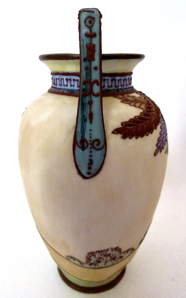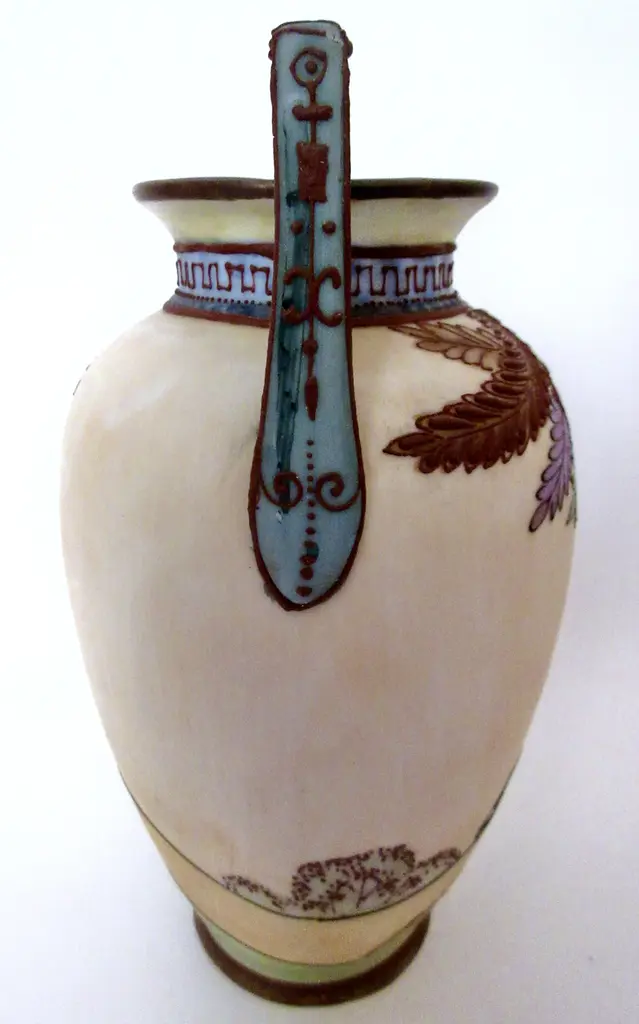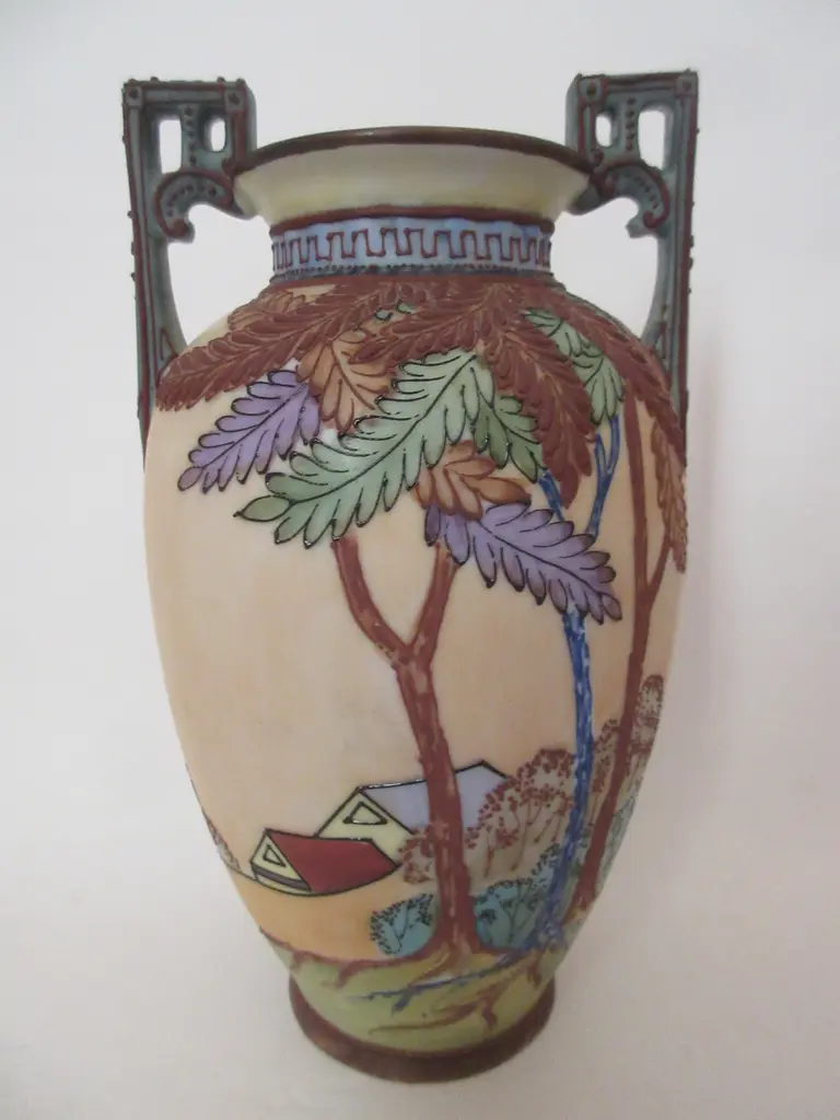 Early 1900s Japanese Arts & Crafts trophy vase, hand-painted by a gifted artisan who chose an él��gant color palette to portray trees and differently-hued leaves near a country home. The other side continues with more beautfully rendered leaves and two tiny birds flying over the horizon. He decorated the two teal blue handles and the neck with exquisite mariage beads, curls and Greek key décorations. Marked "Hand-Painted Nippon" with a green mark used by Morimura Bros. from 1891 through 1921.